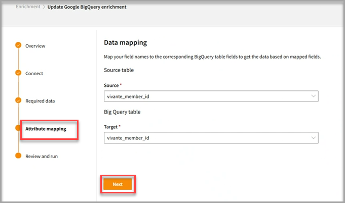 - Attribute mapping: Map the related fields from the customer table and the BigQuery table to get the data based on the mapped fields.