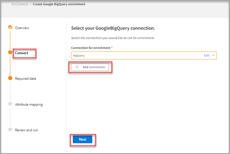 - If you want to change the existing BigQuery connection, select a Connection for enrichment from the drop-down list, then click Edit.