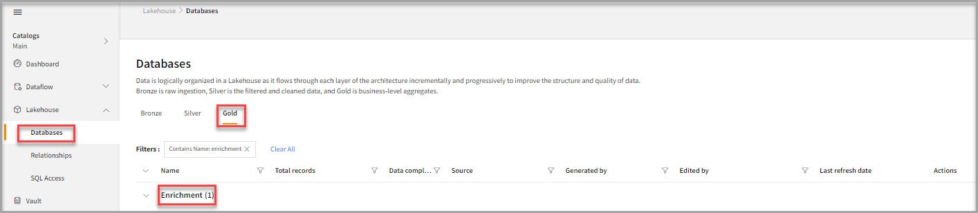 - In the left pane, go to the Lakehouse and click Databases to find your table in the Gold > Enrichment list.