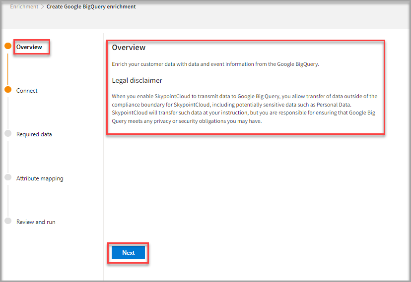 BigQuery is a fully managed enterprise data warehouse that helps you manage and analyze your data. Skypoint AI provides a feature to enrich your customer data with data from the BigQuery enrichment connector.Prerequisites