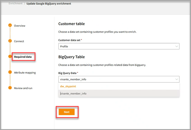 - Required data: Choose a table containing customer profiles and related data from BigQuery to enrich.