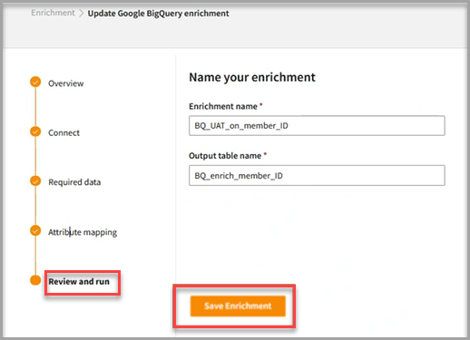 - Review and run: Add the name for the enrichment and review the settings before running the enrichment.