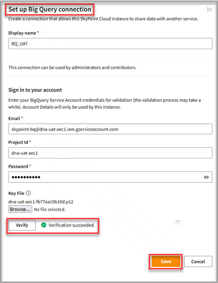 - Enter your BigQuery Service Account credentials for validation – Email, Project Id, Password.