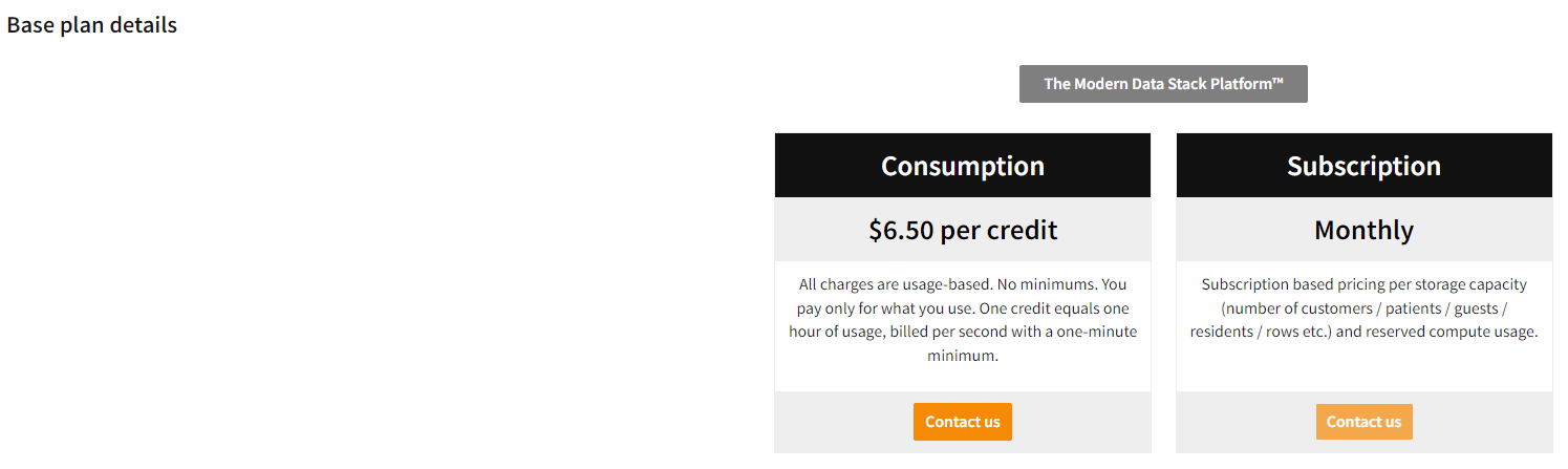 | Monthly | Enables you to pay monthly through subscription-based pricing per storage capacity and reserved compute usage. |