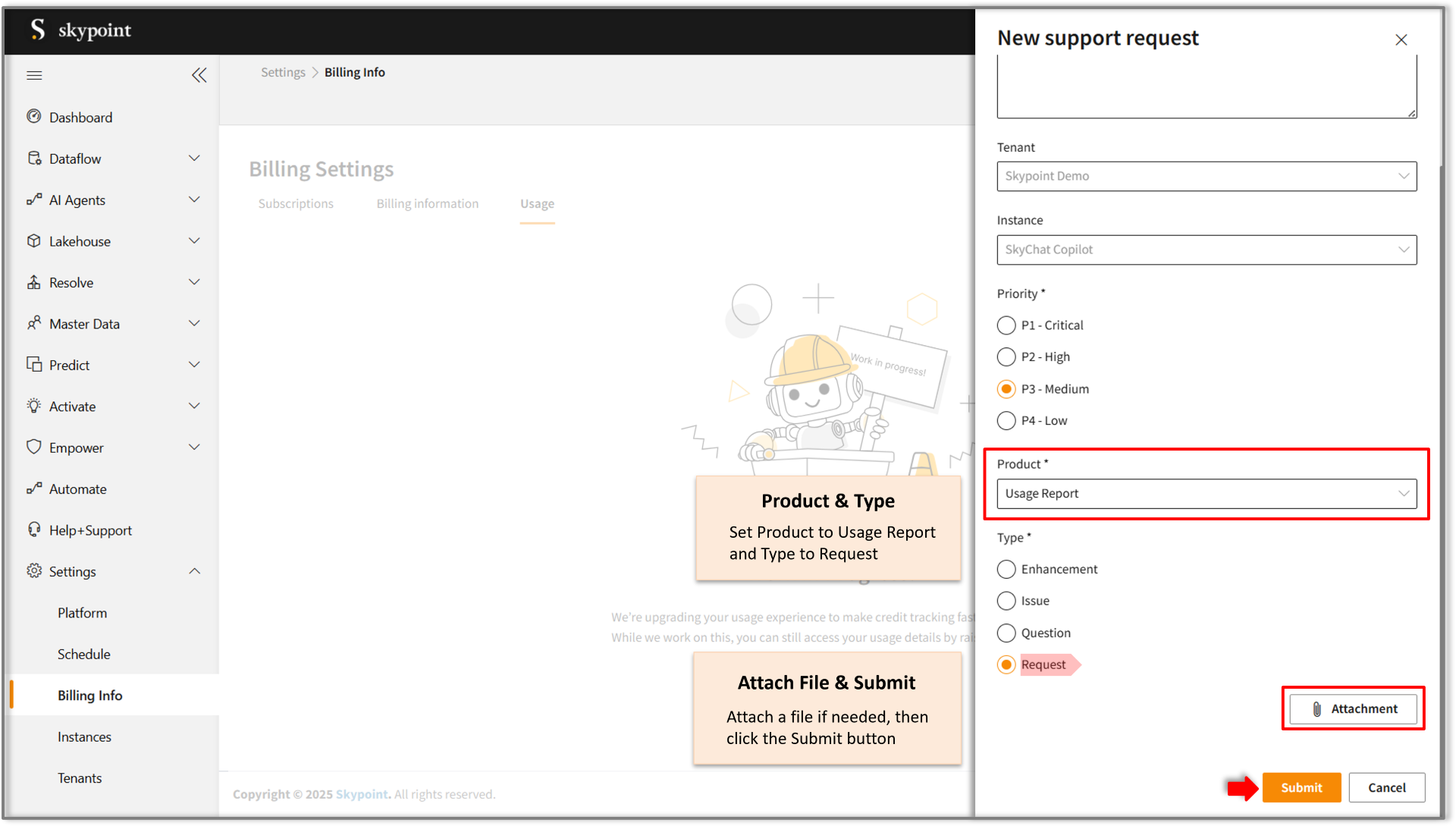The Usage Report with computed details can typically be accessed from the Usage tab. However, it is currently unavailable due to an ongoing system upgrade. In the meantime, compute details can be manually requested by submitting a Support Request Form, available in both the Help + Support Module and the Usage tab under Billing Info in the Settings module.Steps to Submit a New Support Request for a Usage Report