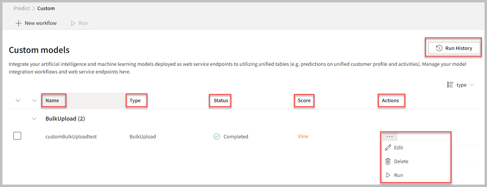 | Run History | See the run history of the custom models. |