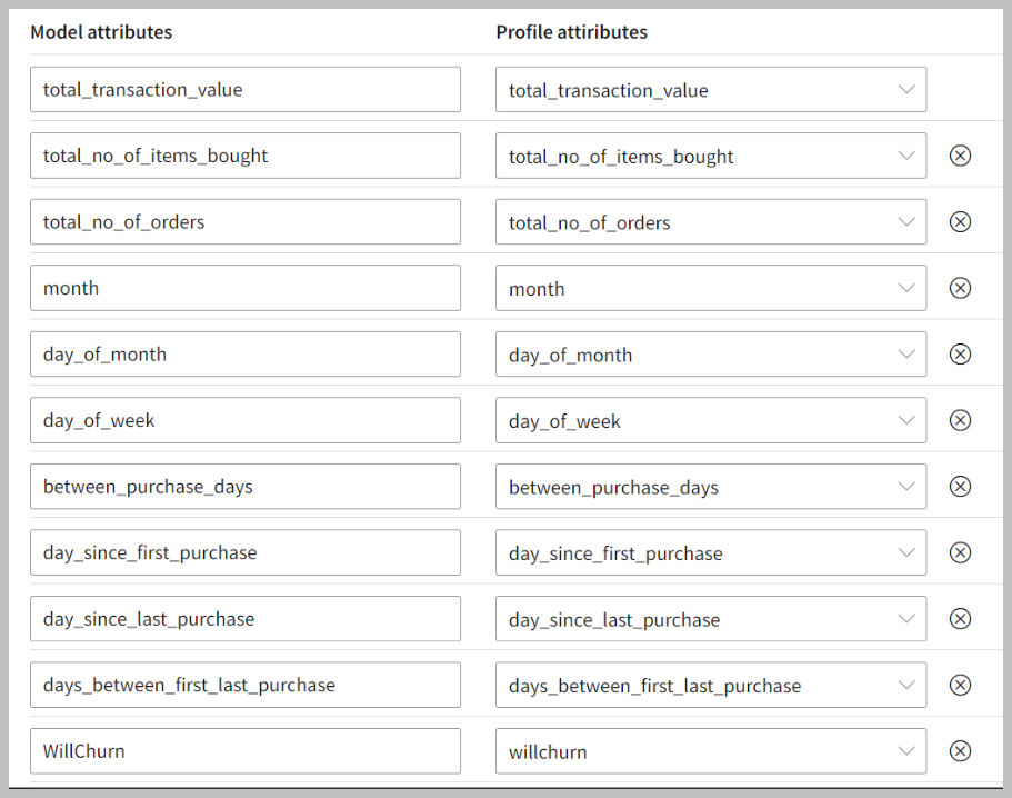 - In the Model attributes box, enter the attributes to map the model column as per selected profile attributes.