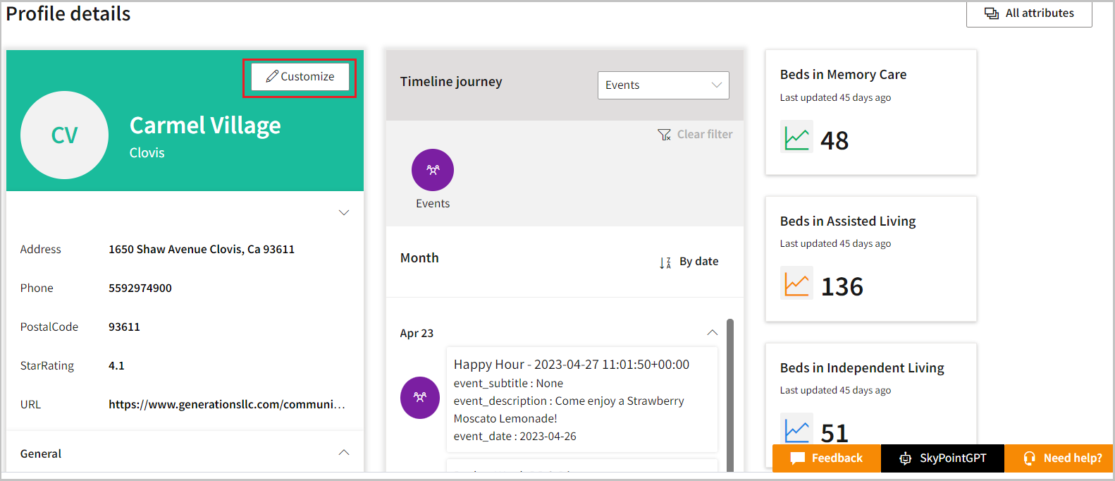 - The profile details card can be customized as desired. However, a default configuration is always set for the user’s convenience. To customize sections and fields within a section, click on Customize button.