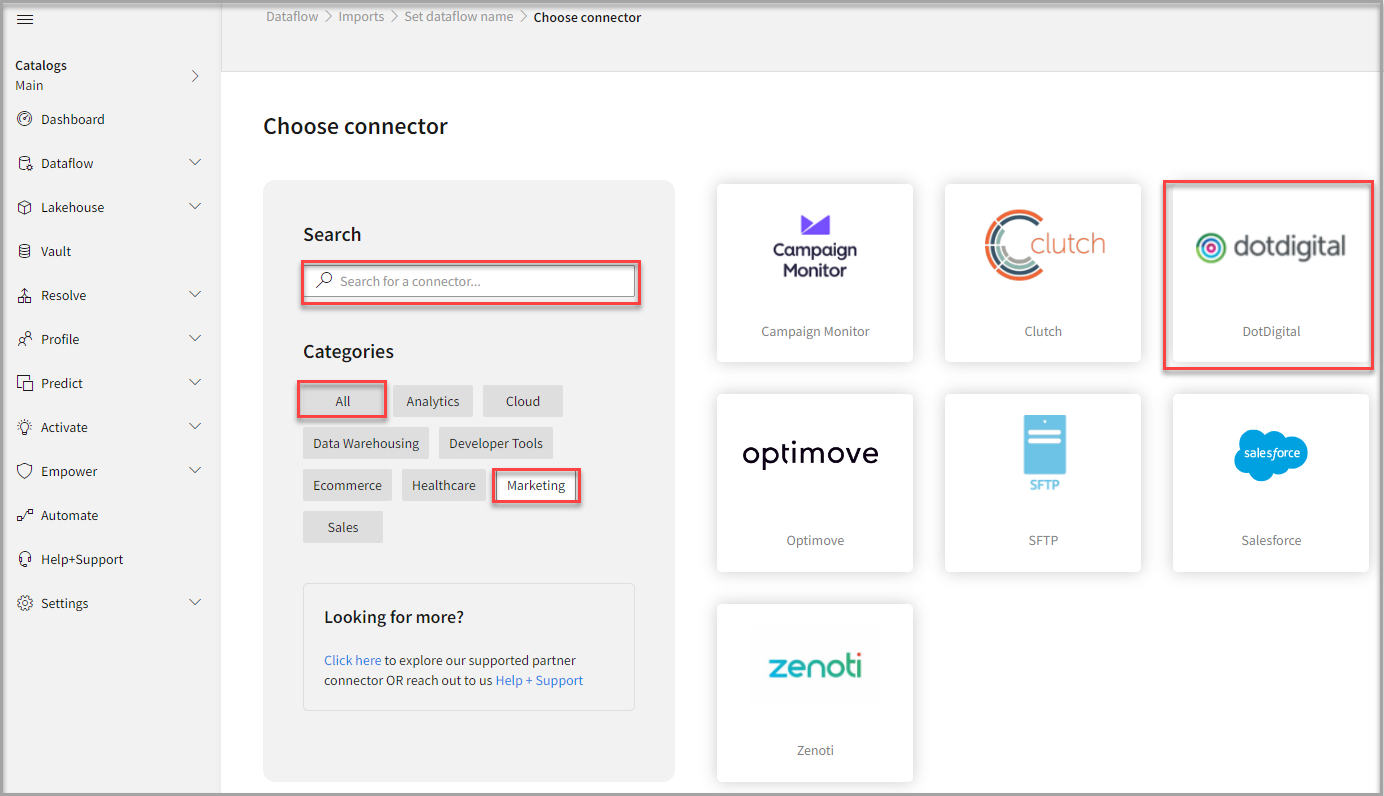- In the All or Marketing tab, select the dotdigital connector to start the configuration.