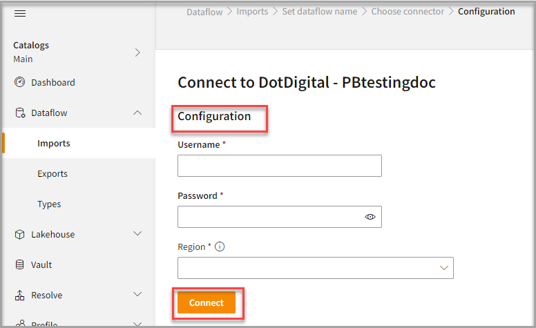 - Enter your credentials such as Username, Password, and Region to configure with the Dotdigital connector. For details about the Dotdigital account, click Get account information. If you want to create an API user, refer to the setting up your API user. For more information about API endpoints and regions, see API conventions.