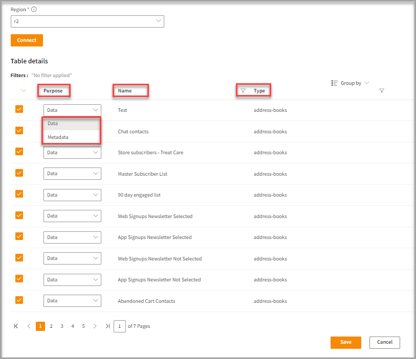 | Purpose | Option to assign a purpose (Data or Metadata) for each table. |