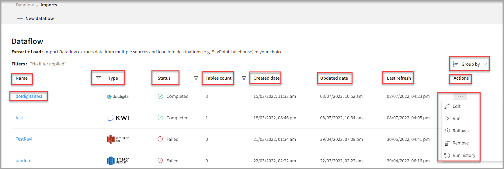 | Modify the Dataflow | Select Edit and modify the Dataflow. Click Save to apply your changes. |