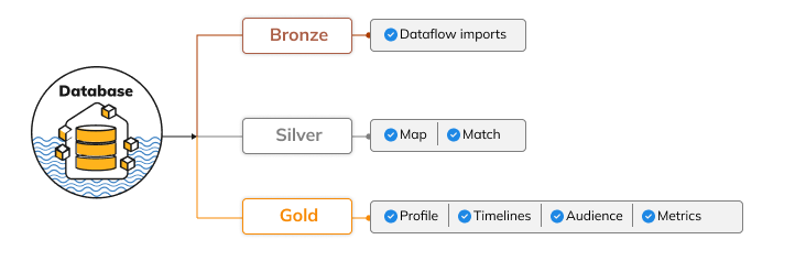 - Gold – Consumption and business level aggregate tables such as Profiles (Customer, Employee, Organization etc.), Timelines, Audience, and Metrics.