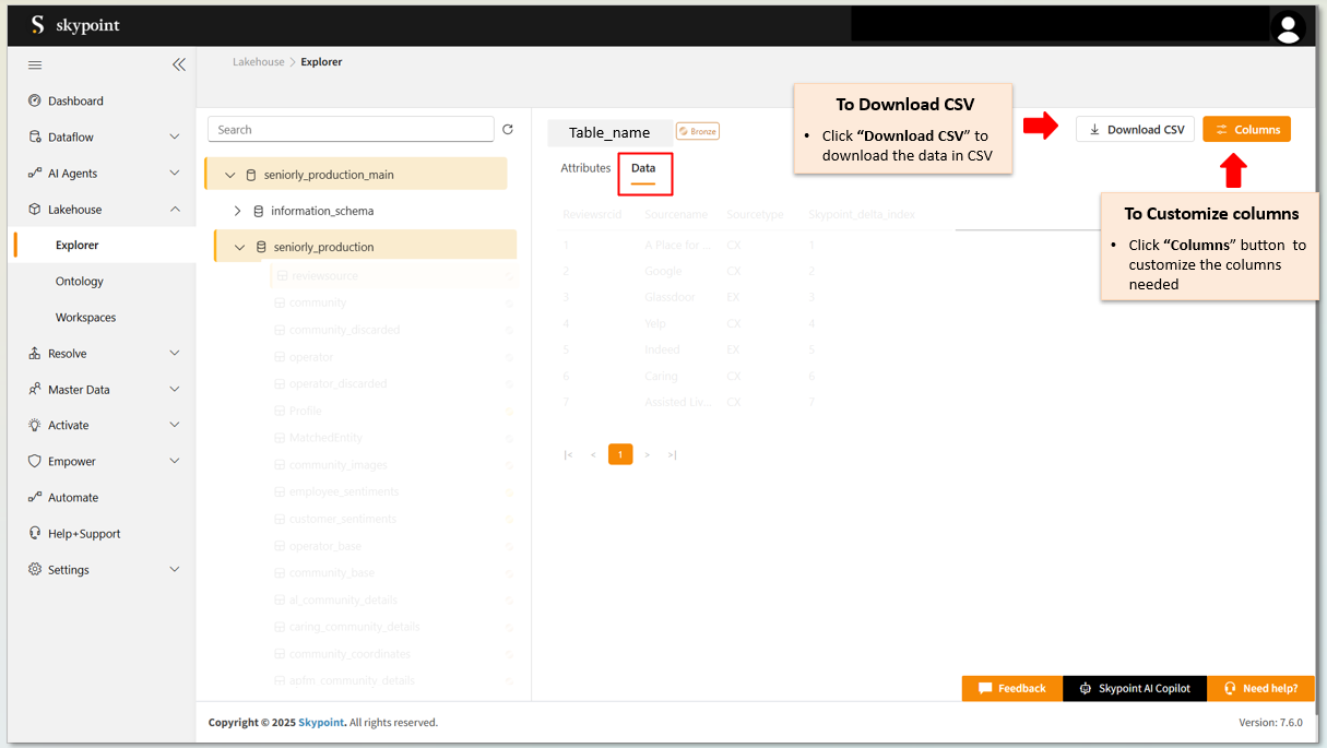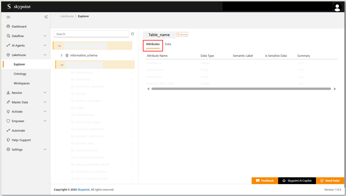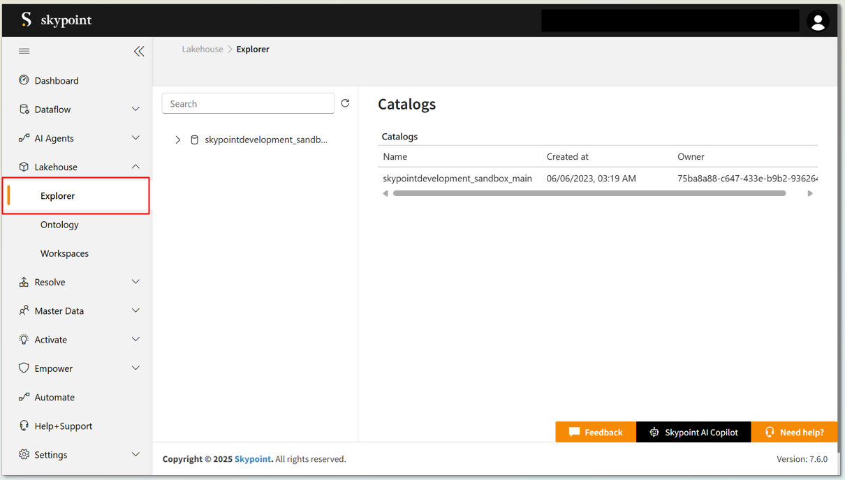 For every import, Skypoint AI adds a database to its analytical store known as Lakehouse.- In the left pane, go to the Lakehouse > Explorer.