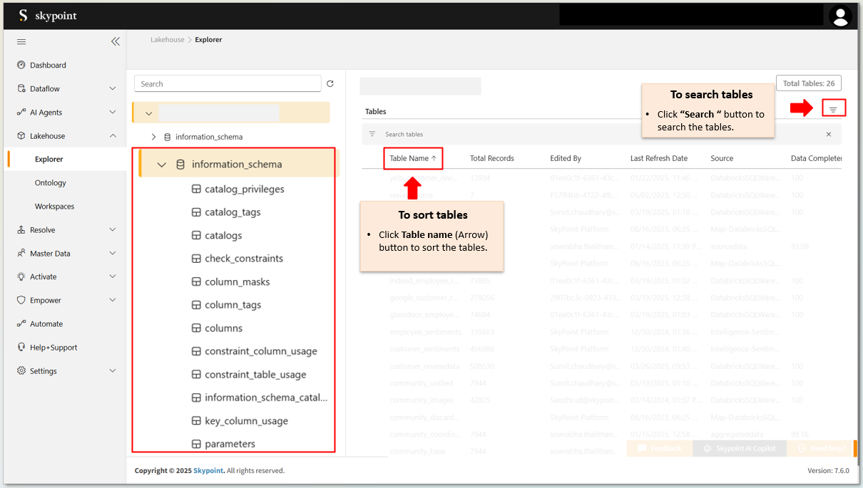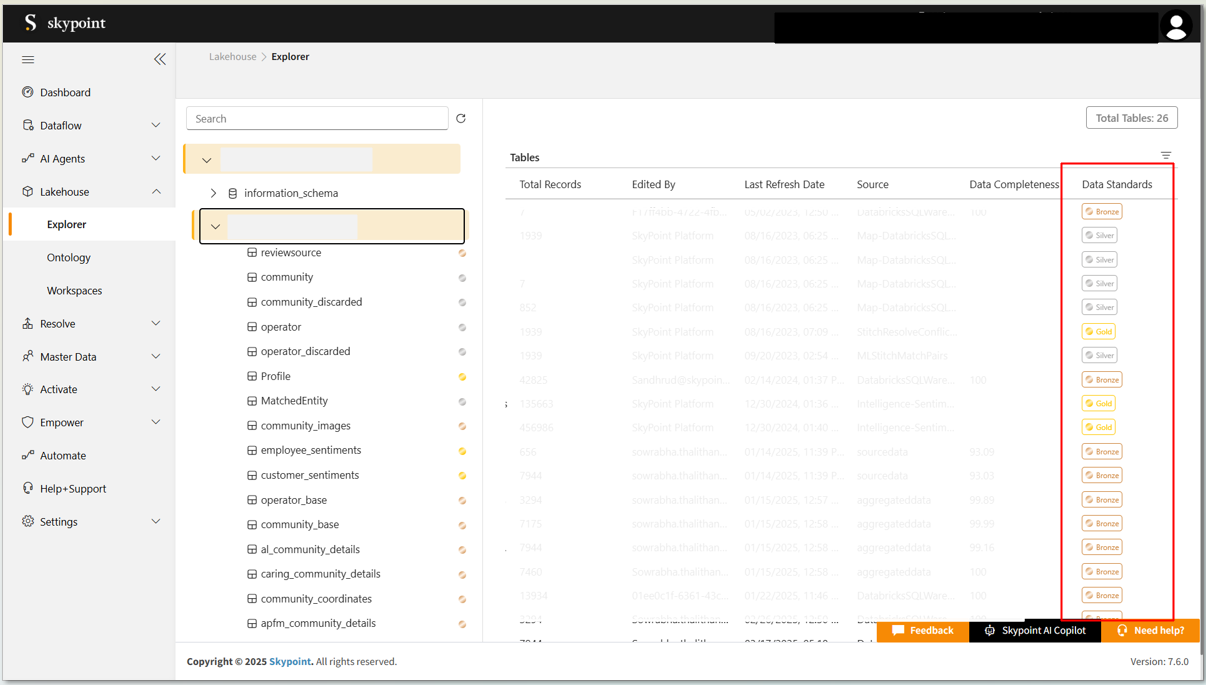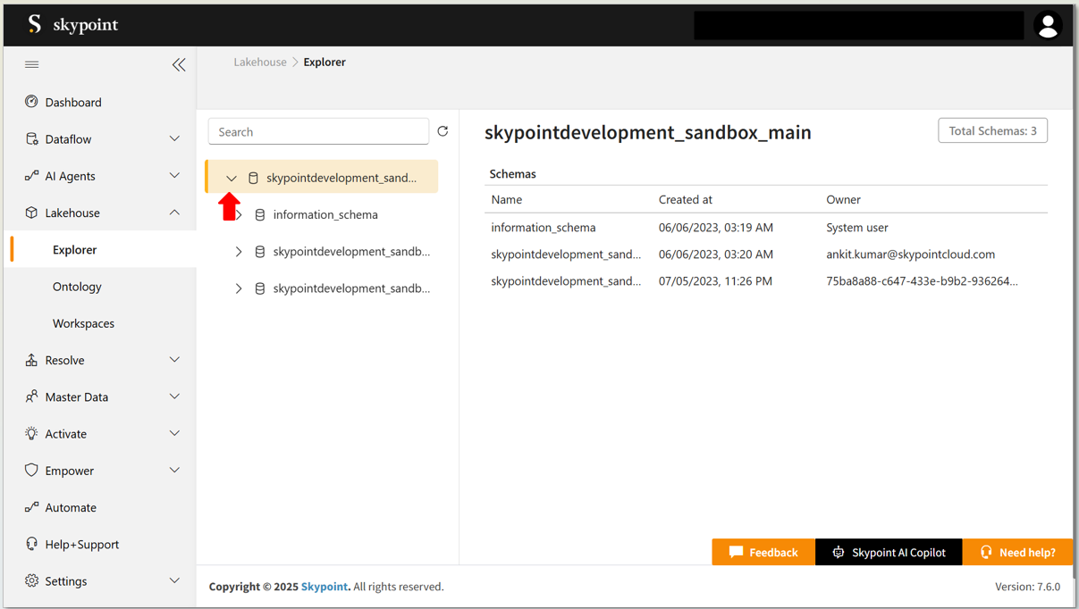 The Databases Explorer in Skypoint Studio provides an intuitive, unified interface to browse all data in your Lakehouse. It leverages Databricks Unity Catalog to organize data assets (catalogs, schemas, and tables) in a hierarchical structure. This upgrade offers a comprehensive view of all schemas and tables under Unity Catalog, greatly improving data visibility, organization, and accessibility within the Lakehouse for a seamless and efficient user experience. All changes made through Lakehouse SQL (such as adding or deleting records in a table) are synced to the Lakehouse in real-time, ensuring the explorer always reflects the latest data.