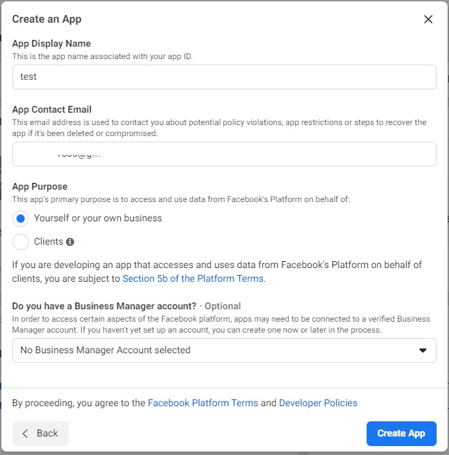 - Enter the name of the display name of the app, the contact email and add the purpose for creating the app.