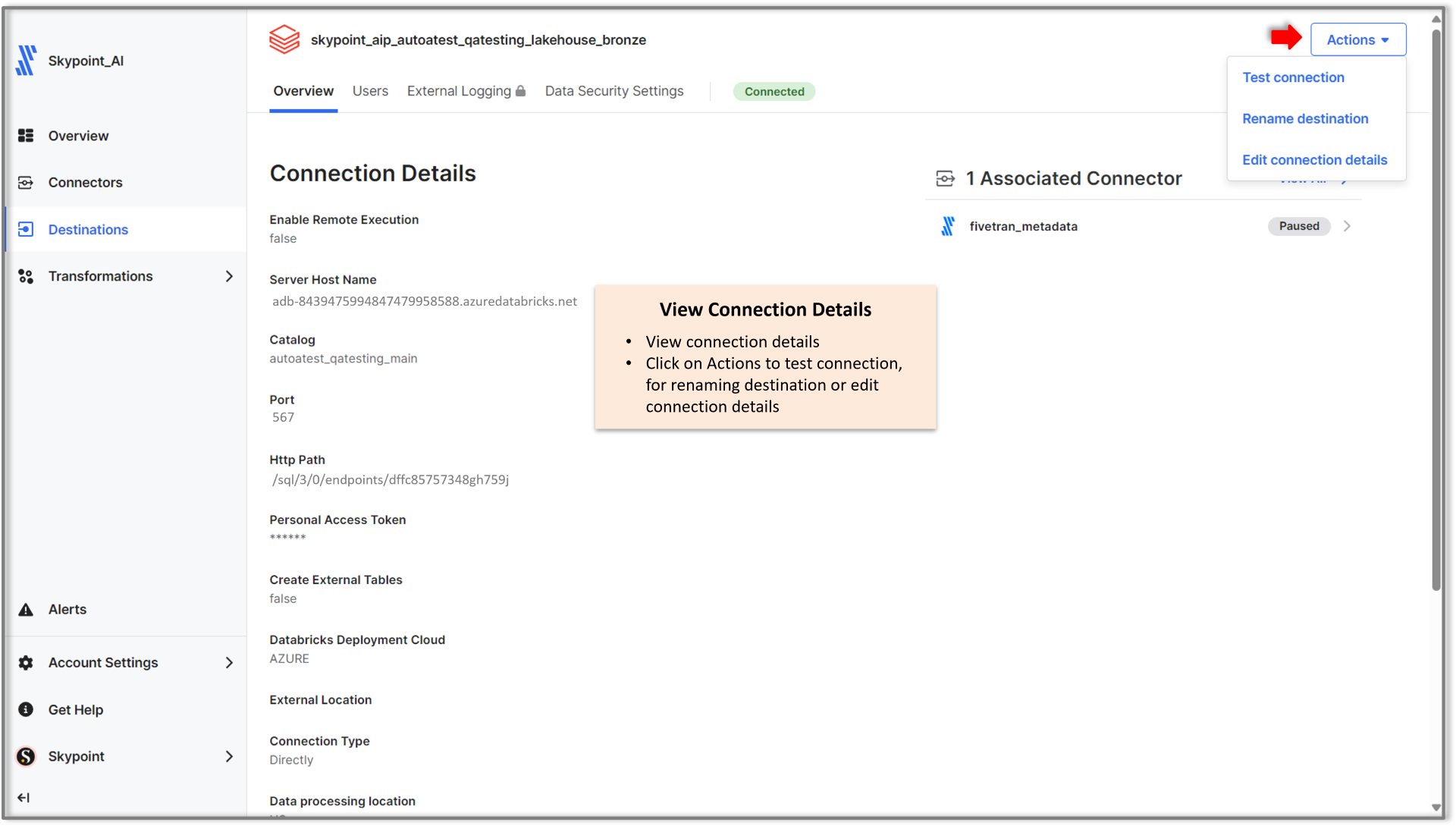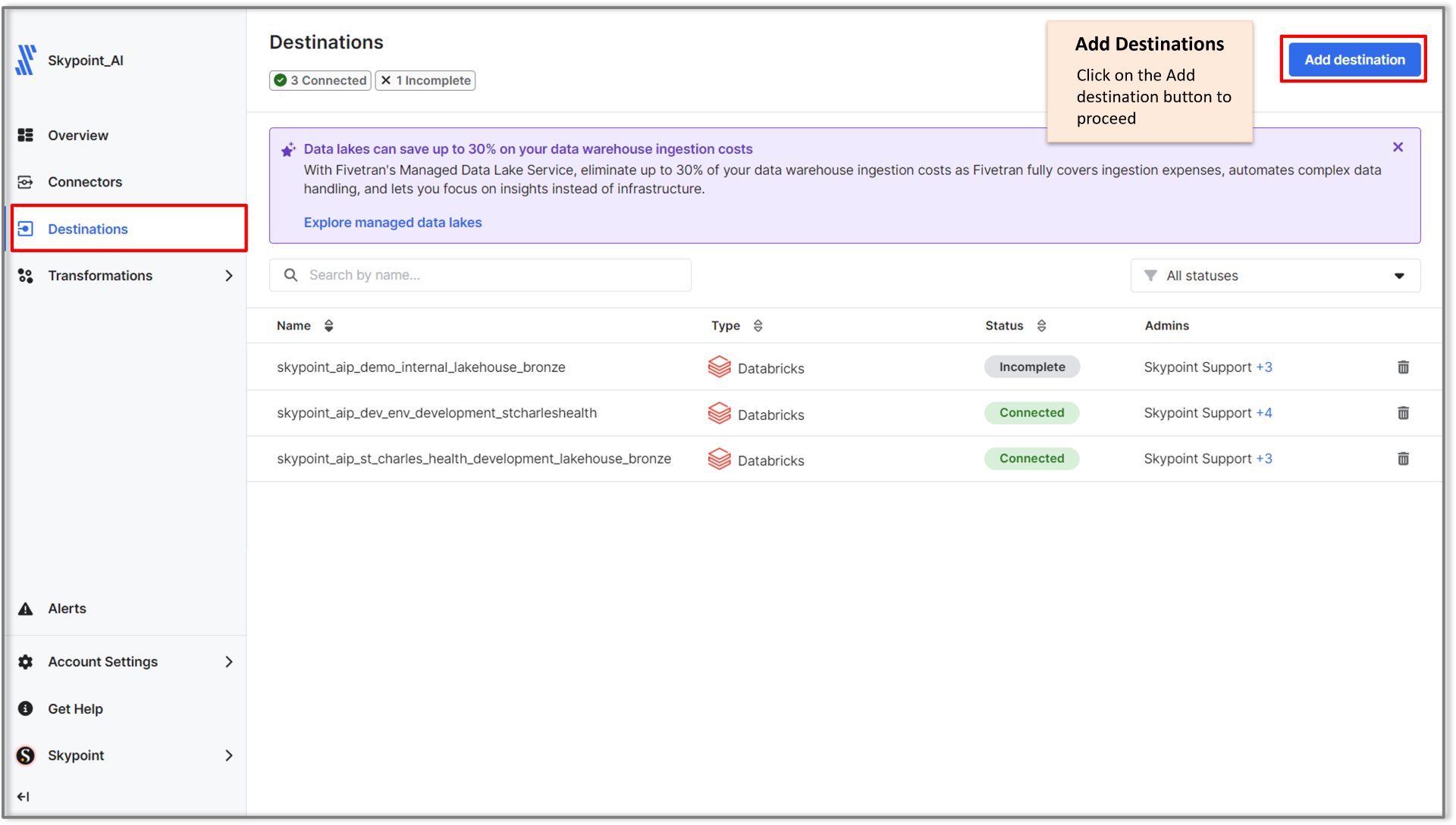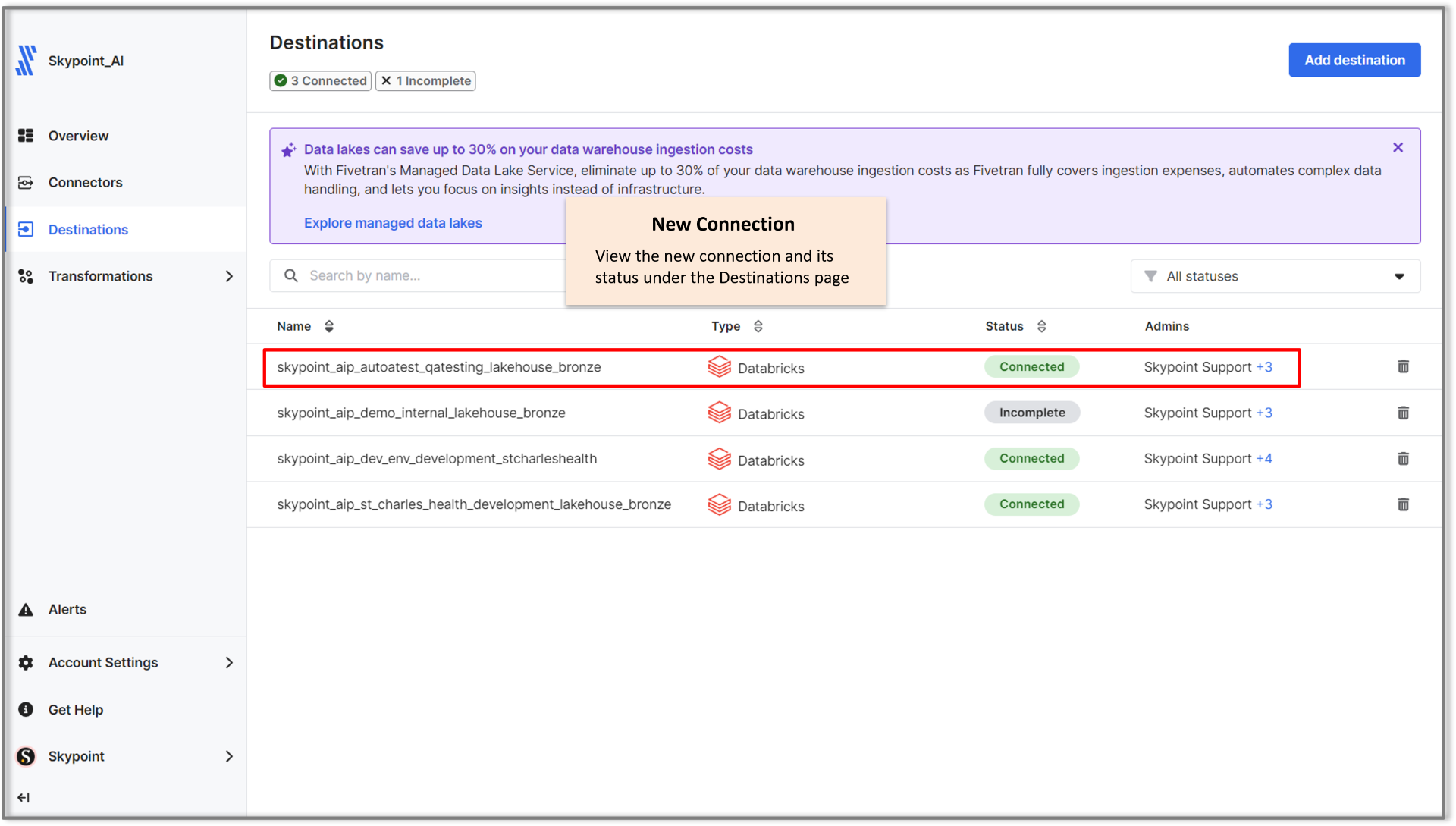 Congratulations! You’ve successfully connected Fivetran with Databricks on Skypoint AIP. Your data pipeline is ready to sync securely!