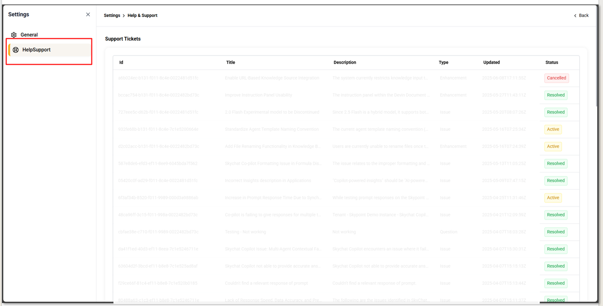 All tickets raised from Copilot are accessible from the Settings page:- Click on the Settings gear icon from the copilot interface.