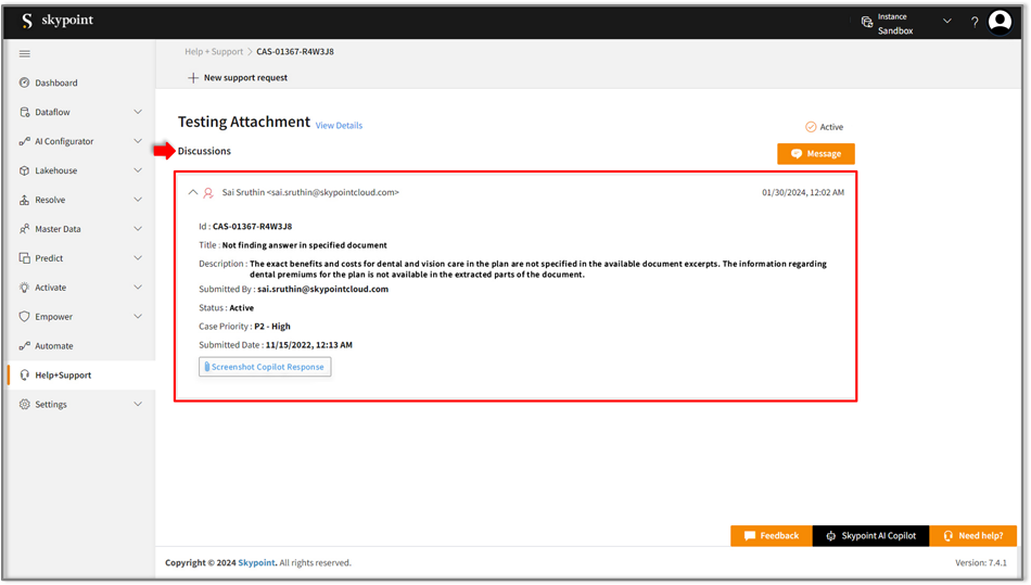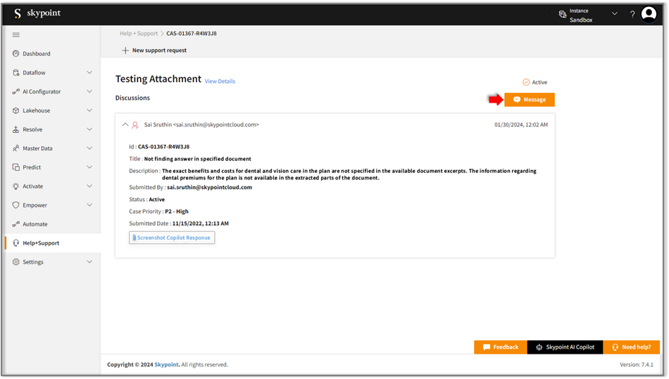 and it allows you to interact or follow up with the Skypoint AI support team using the message button in the top-right corner.