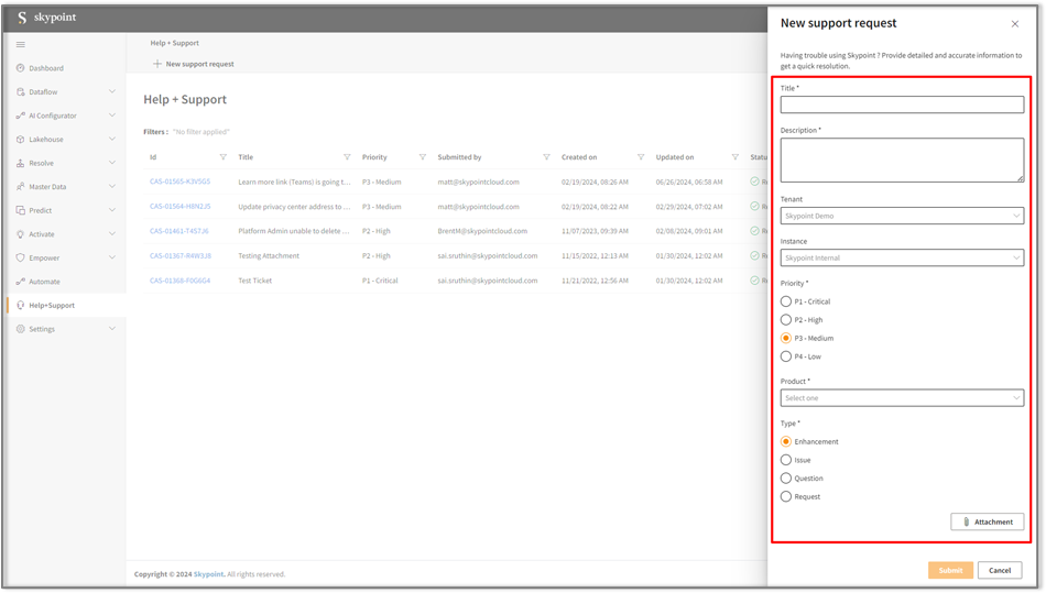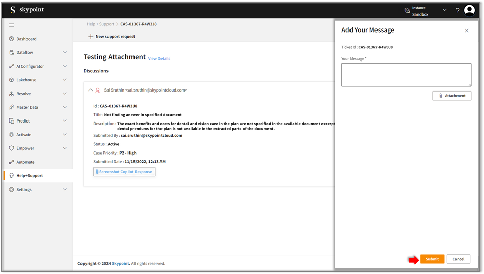 - If needed, click Attachment to upload reference documents to help Skypoint AI Support identify and resolve the issue quickly.