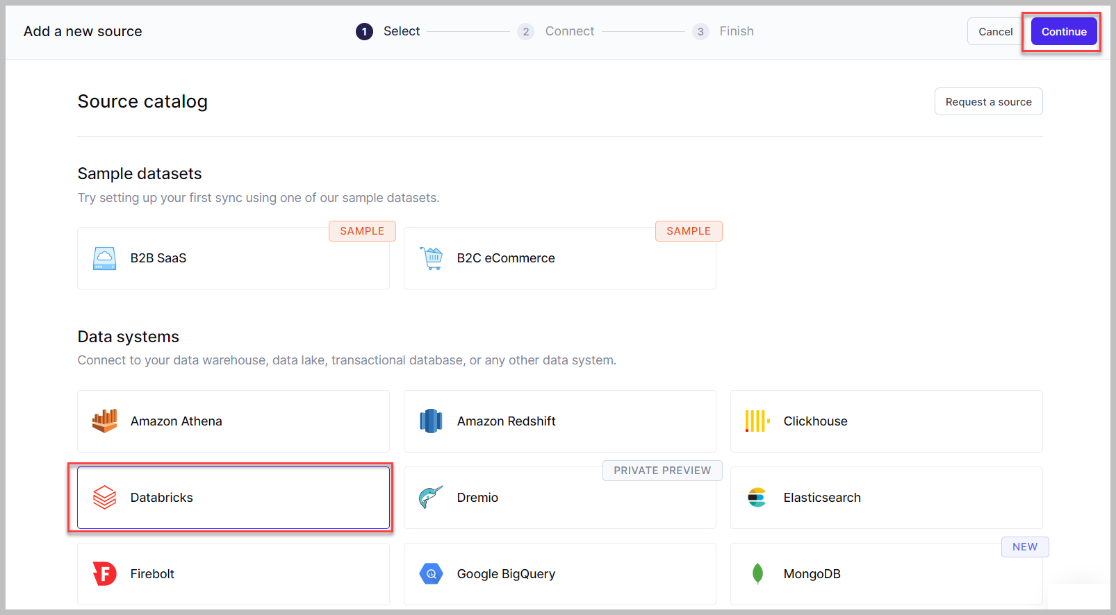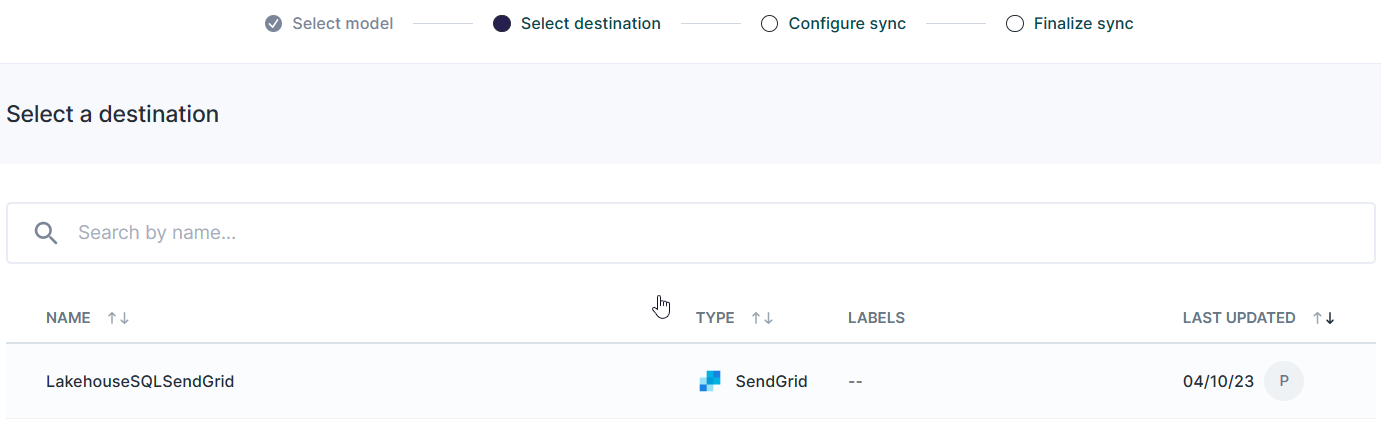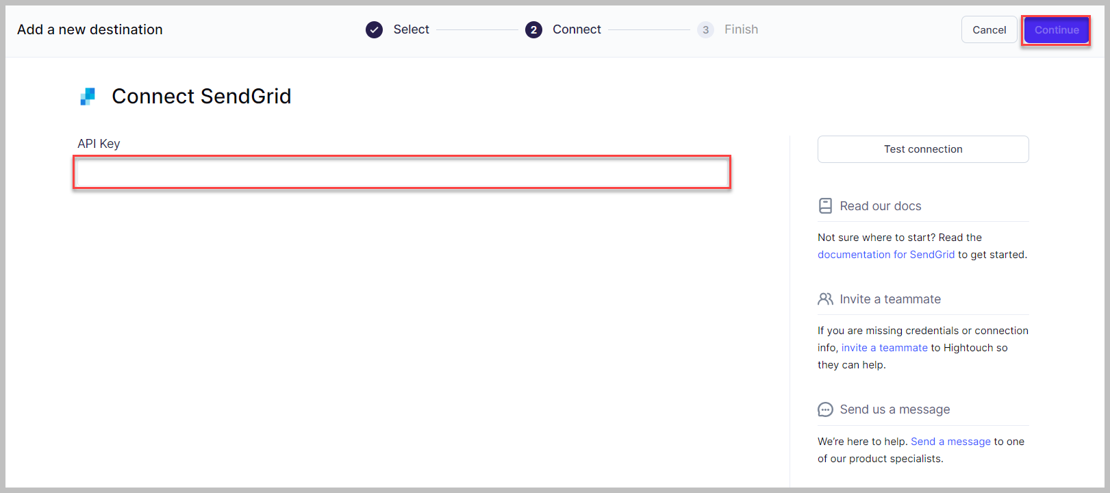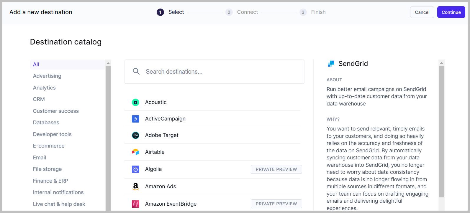 - Select your Destination catalog and click on Continue. For instance, in this section, we create a connection with the SendGrid connector for exporting data.