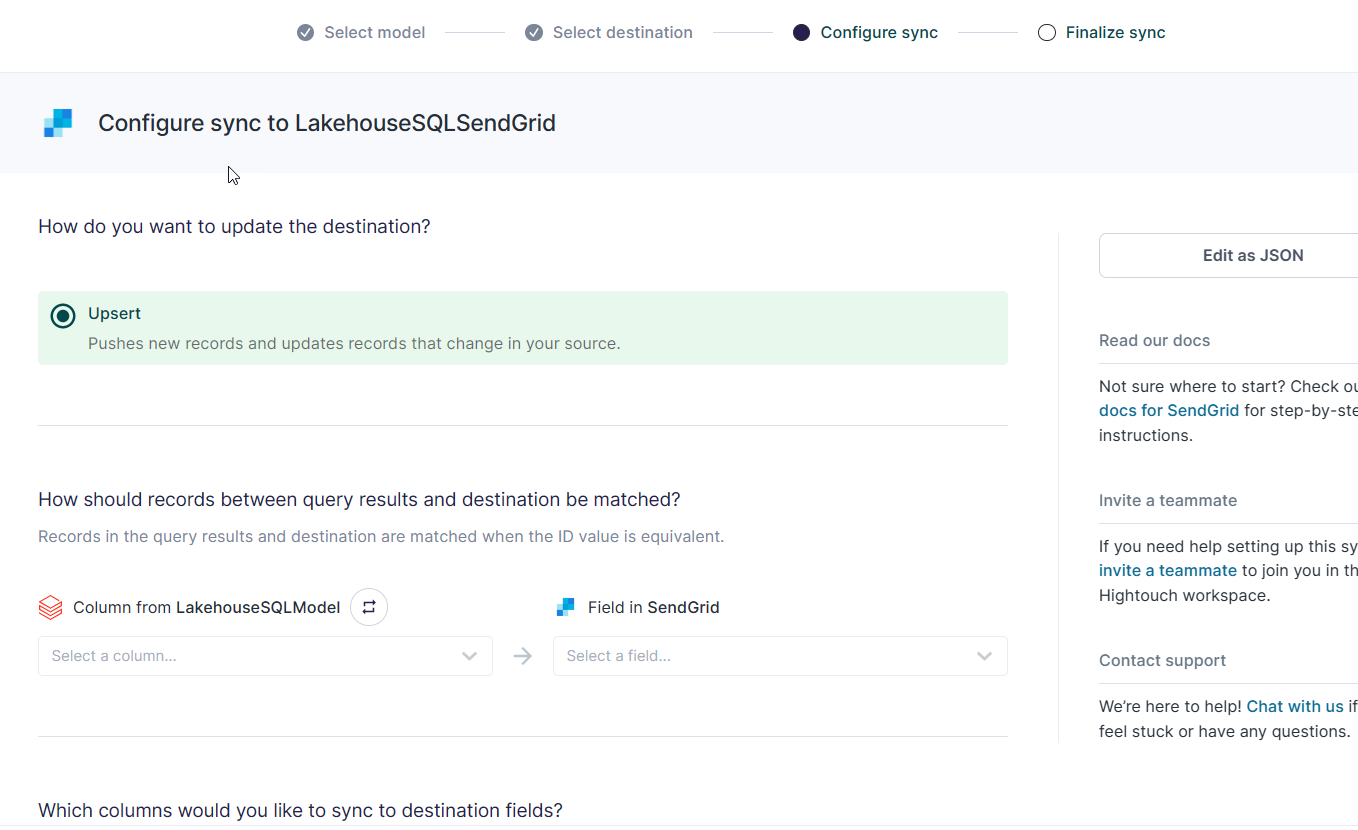 - Configure the sync to the destination by selecting the primary keys and mapping the necessary fields between the source and destination tables.