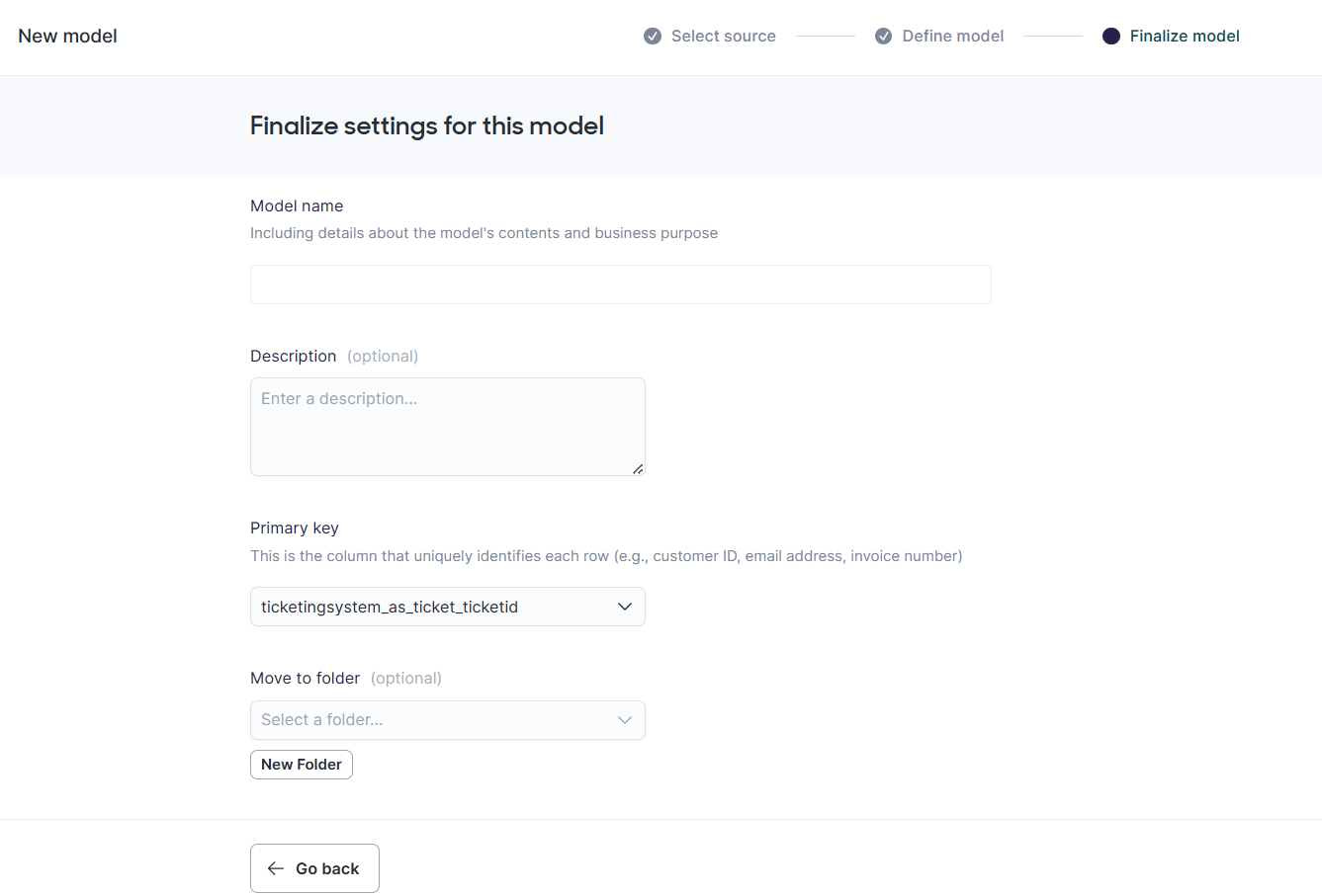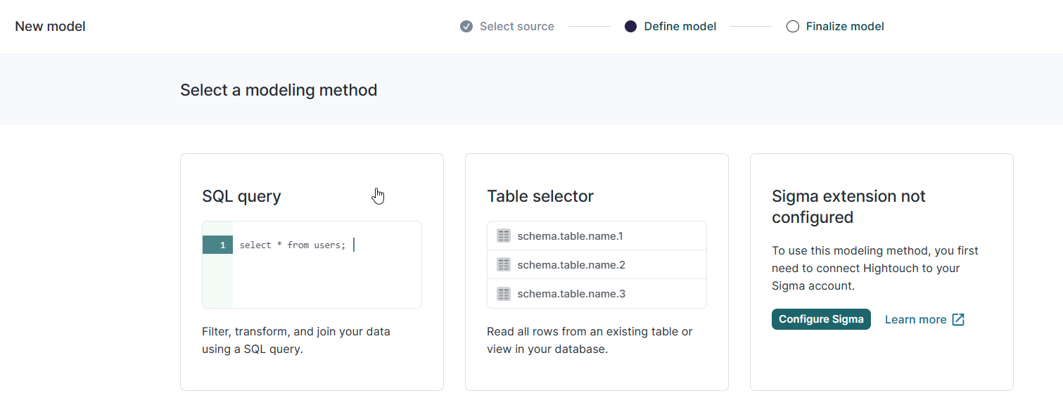 - Define the model. Hightouch provides 3 options for defining the model: Query with SQL, Create from table or view and import model from Sigma.