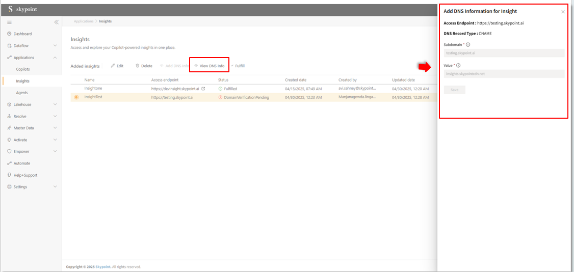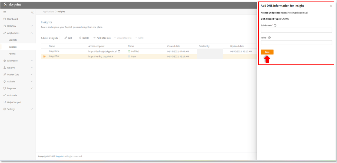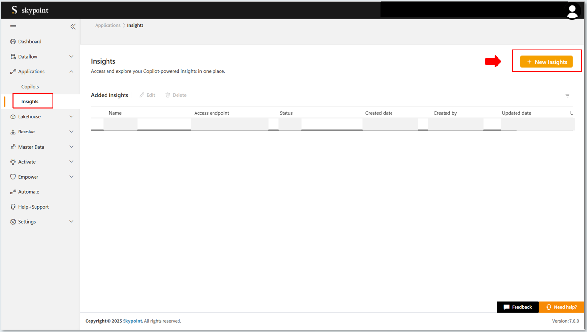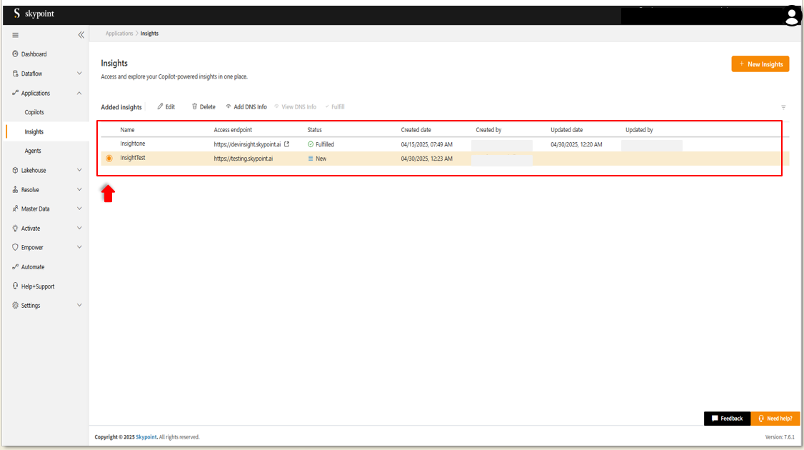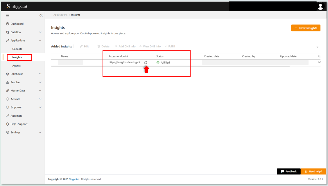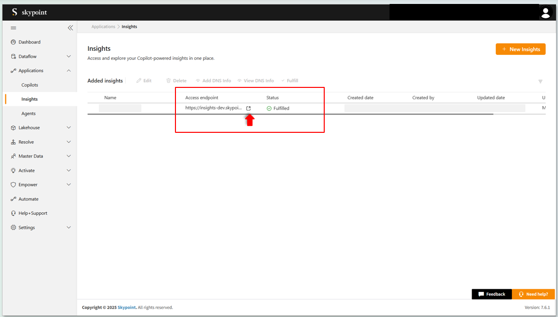 - Click on the Access endpoint (URL) provided to navigate to the Insight application.