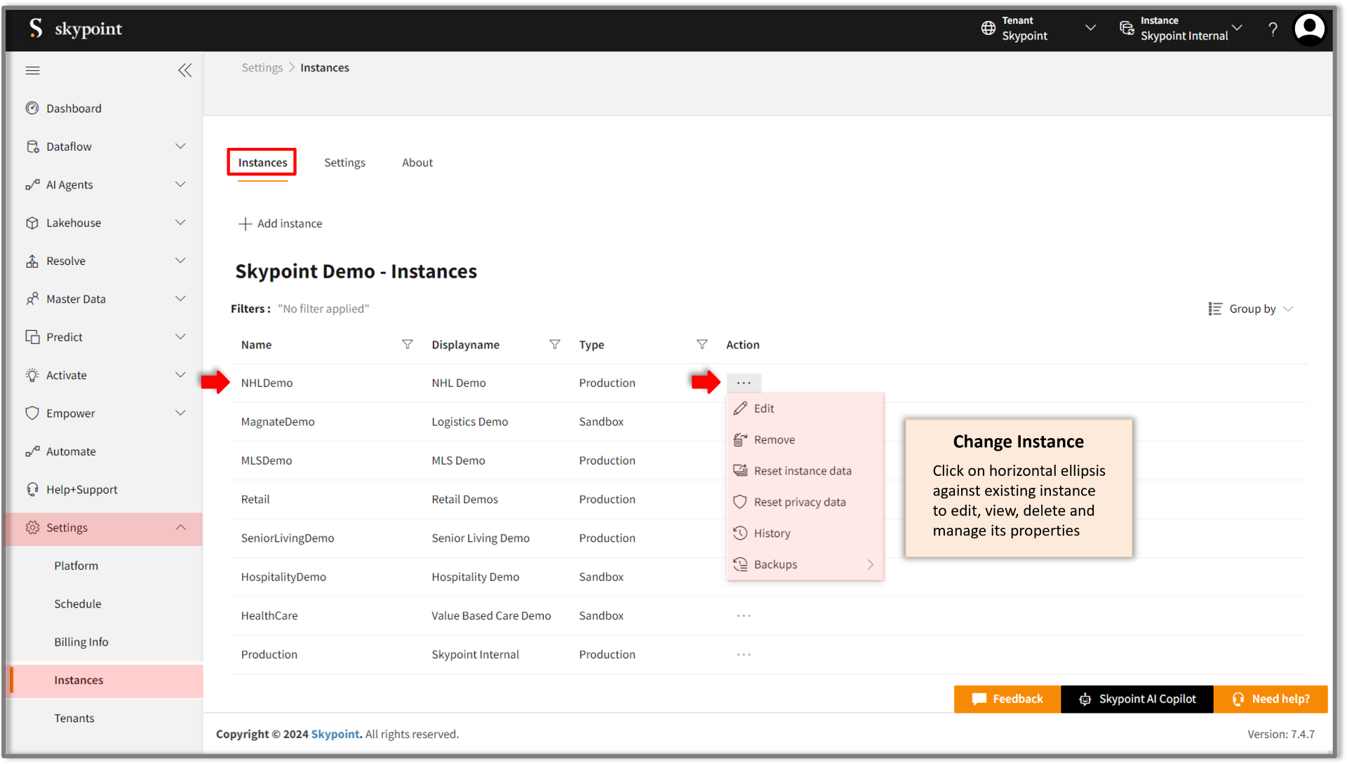Skypoint AI gives you the ability to set up multiple Instances under one Tenant, with each Instance acting as a distinct environment for managing unified customer profiles and accessing quality data efficiently. The platform ensures that changes made within one Instance are isolated, maintaining the integrity of other Instances. This flexibility allows for streamlined organization of customer profiles across various Instances.