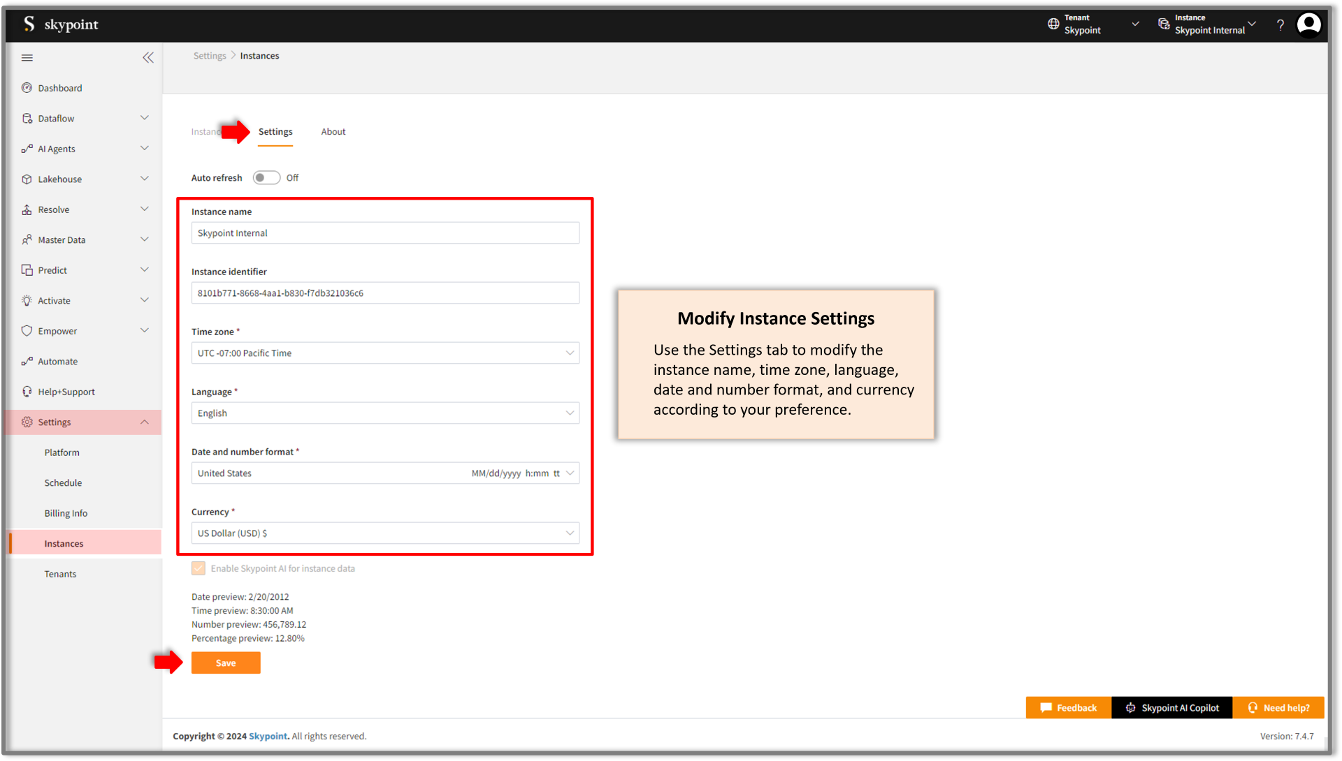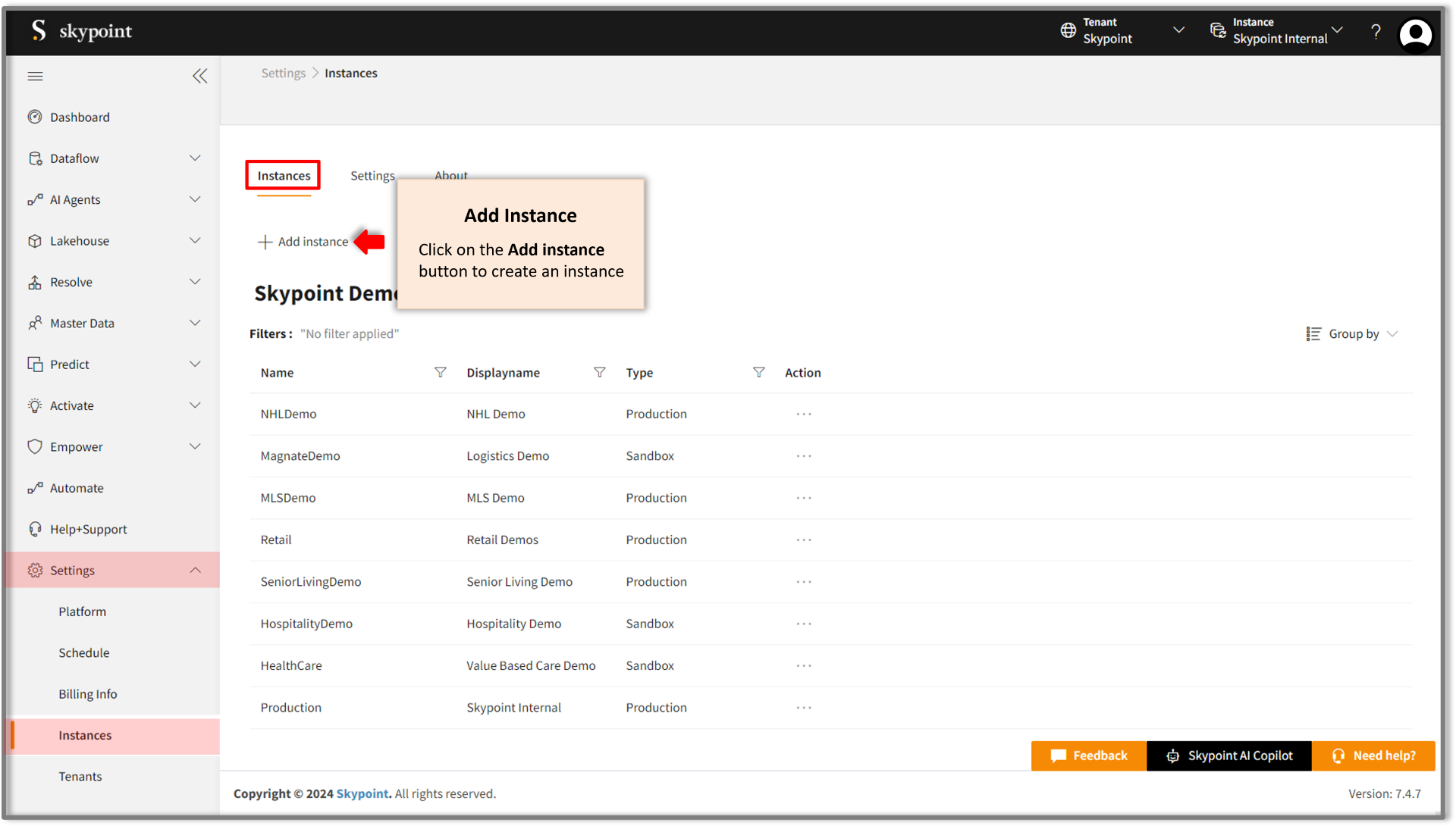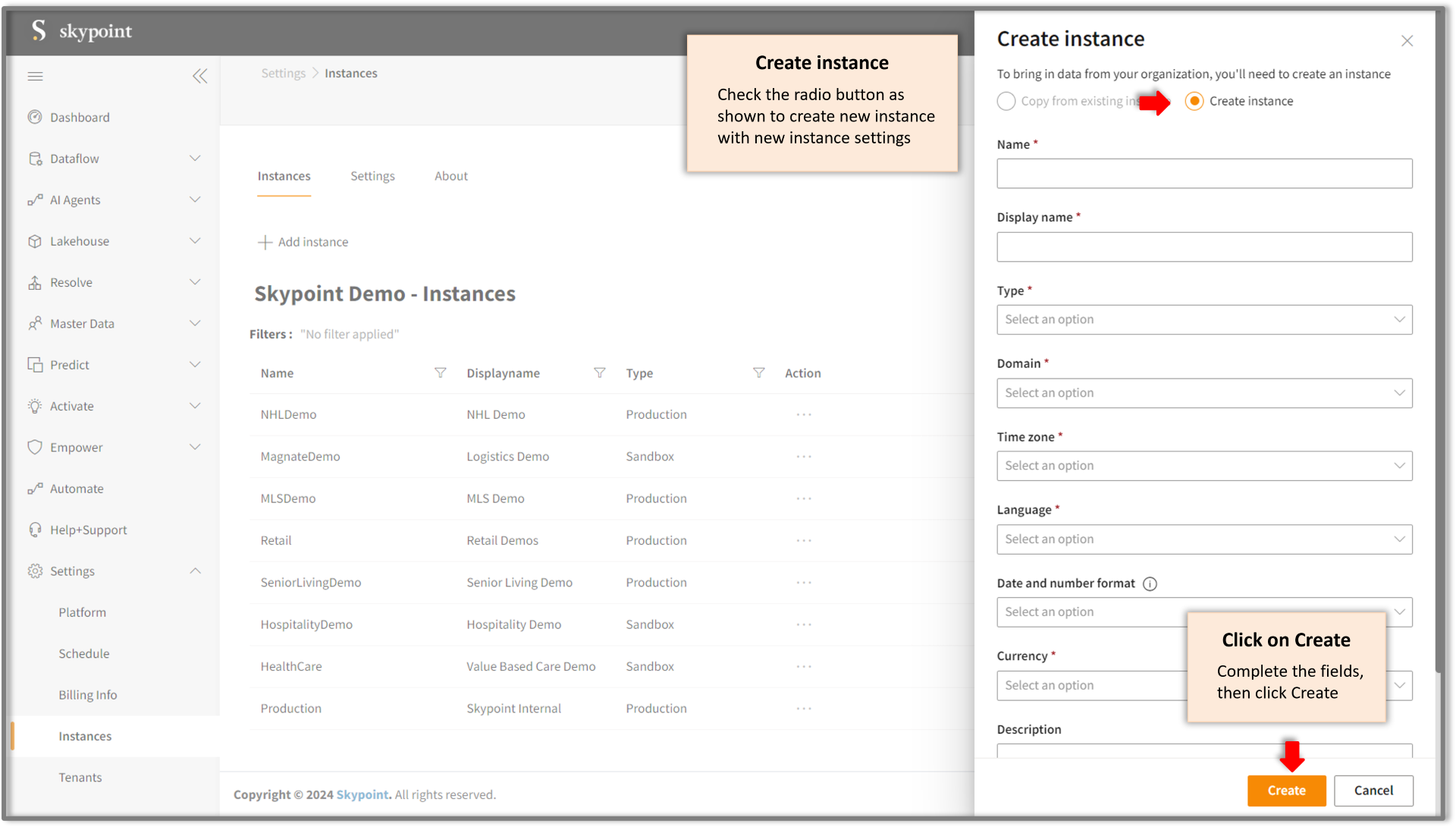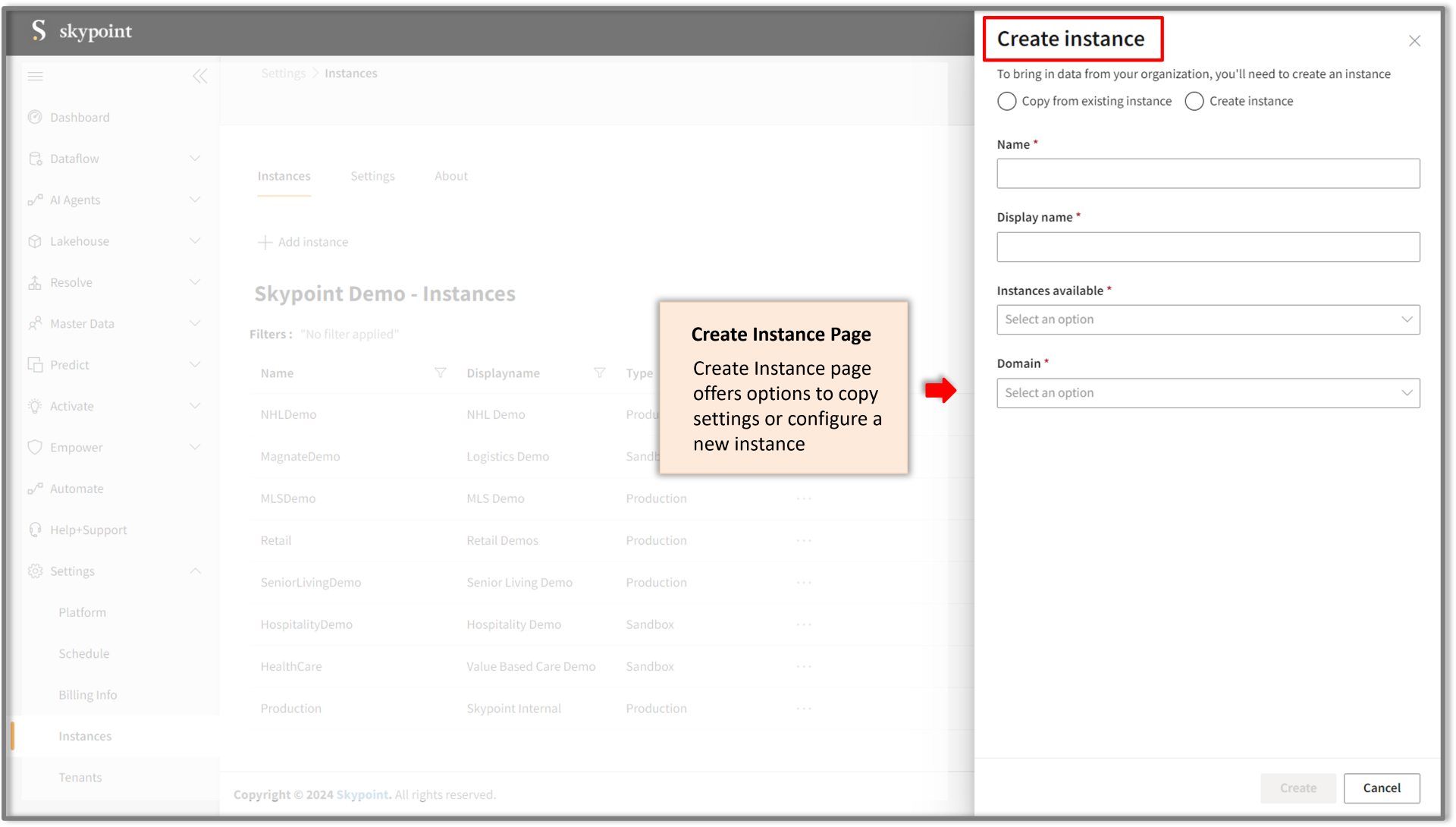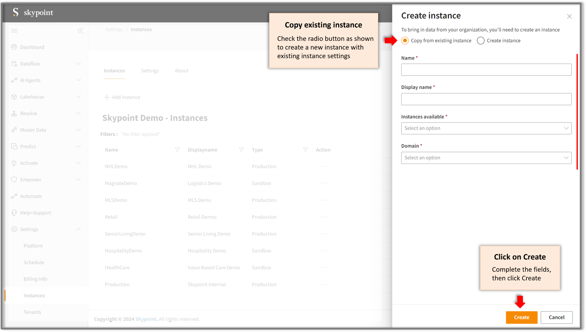 The Skypoint AI platform enables you to copy information from the existing instances as well as create a new Instance. These two options for adding an instance allow you to do the following: