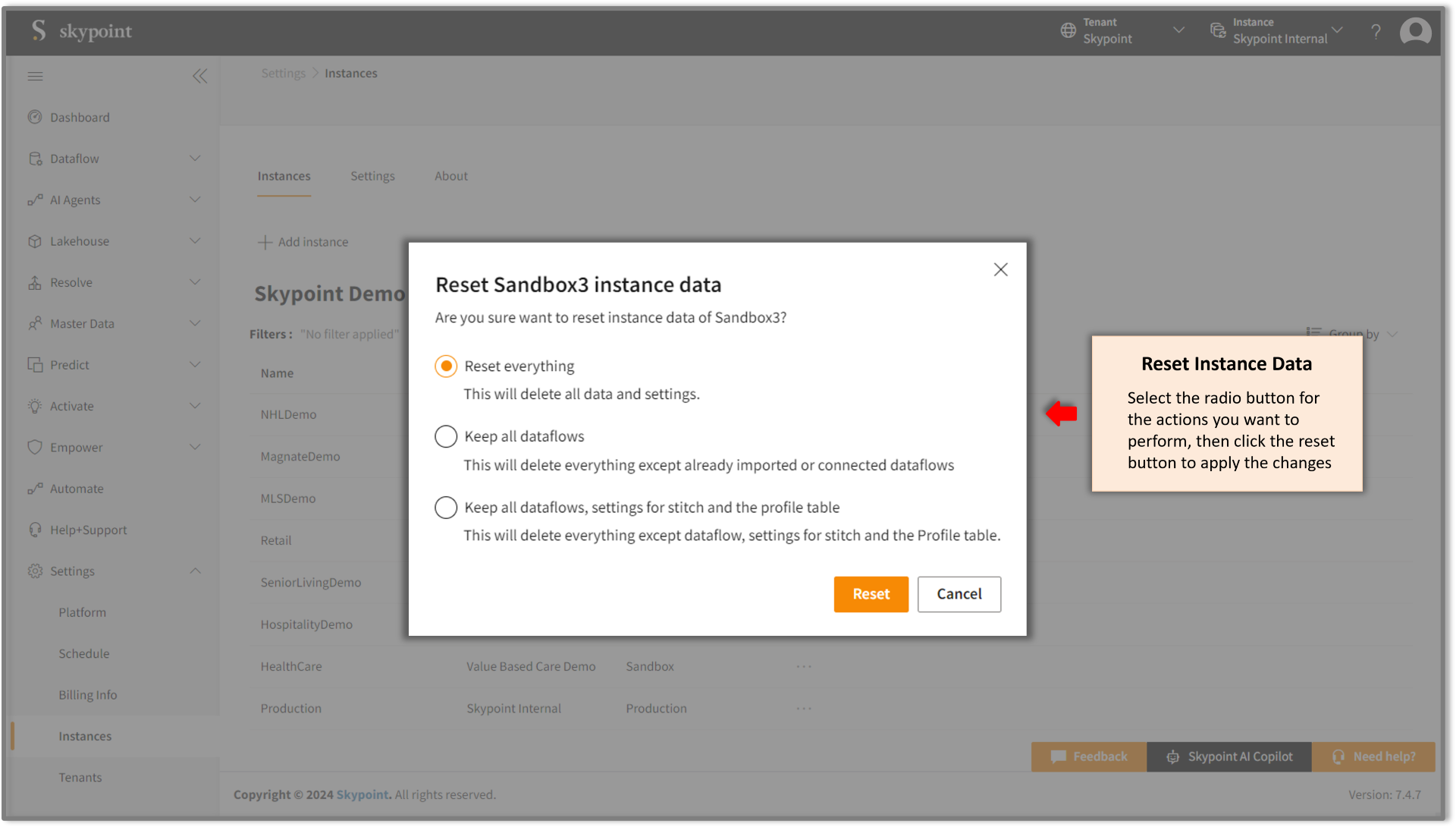 You can specify the data that you want to reset while resetting the Instance data for an existing instance. Follow the below steps: