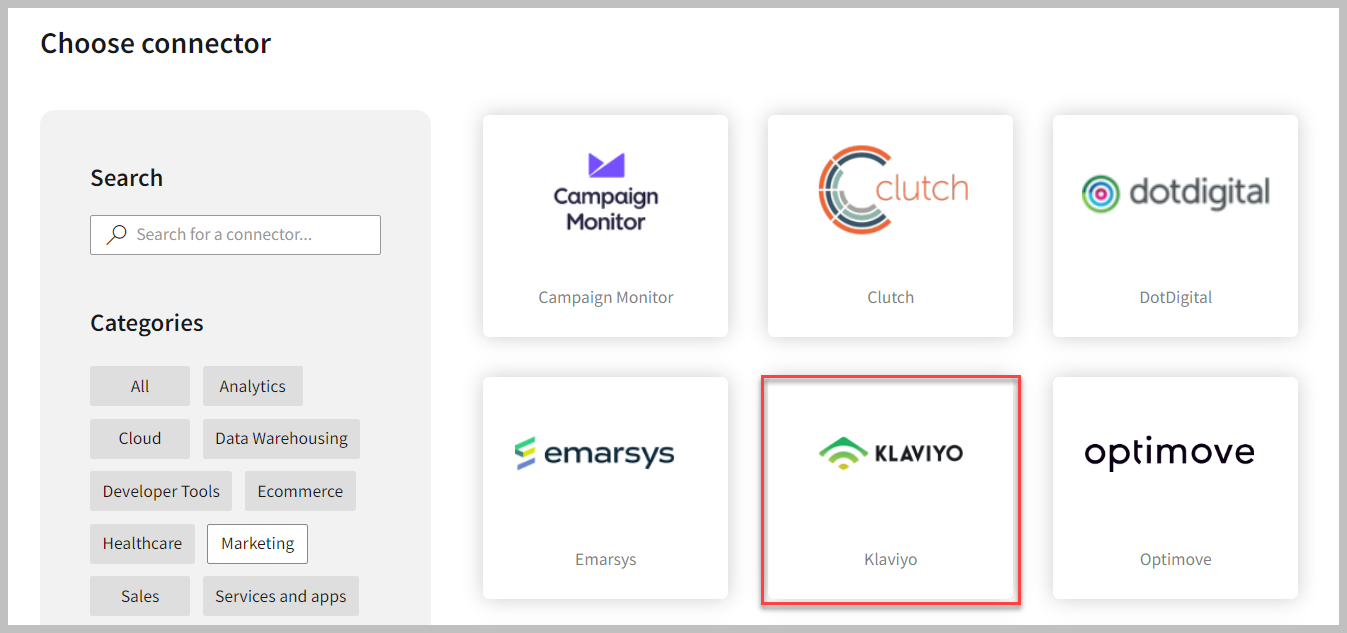 - In the All or Marketing categories tab, select the Klaviyo connector to start the configuration.