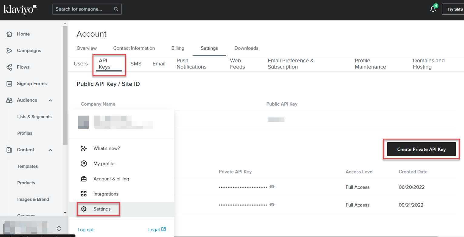 Follow the below steps to create a Private API key:- Log in to your Klaviyo account.