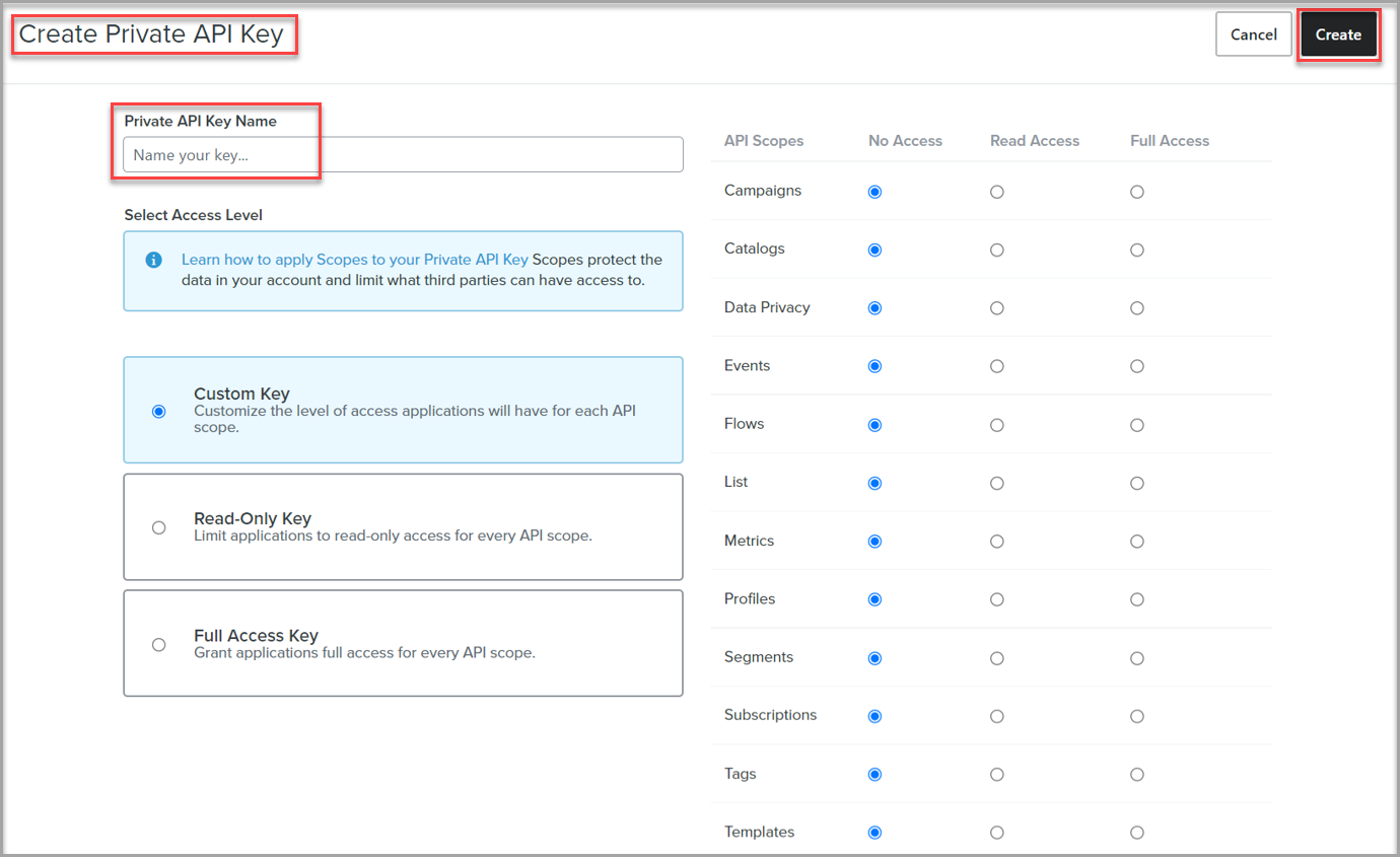 | Full Access Key | Allows third parties to create, delete, or make changes for every API scope. |