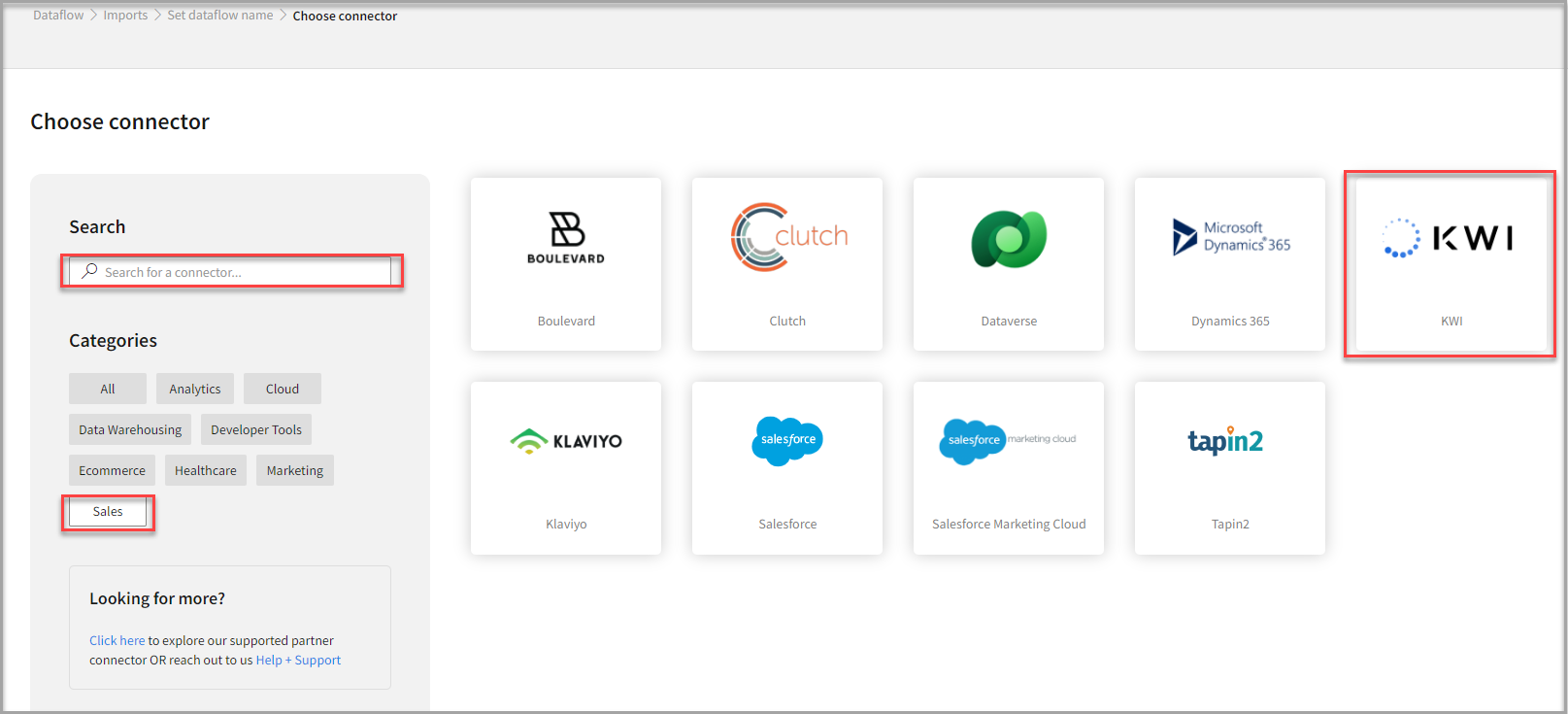 - In the All or Sales tab, select the KWI connector to start the configuration.