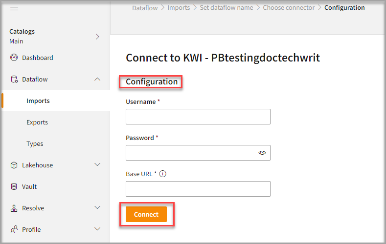 - Enter your credentials such as Username, Password, and Base URL to configure with the KWI connector. For details about each API, click KWI Commerce API Details. Also, if you want to know how to connect with API, click KWI Commerce API Try Out Functionality.