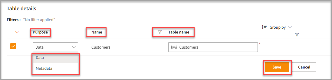 | Purpose | Option to assign a purpose (Data or Metadata) for each table. |