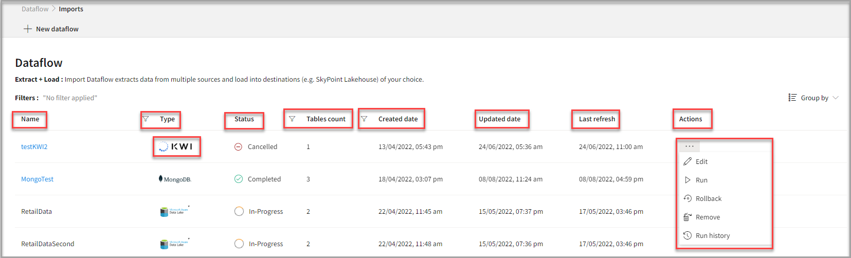| Modify the Dataflow | Select Edit and modify the Dataflow. Click Save to apply your changes. |