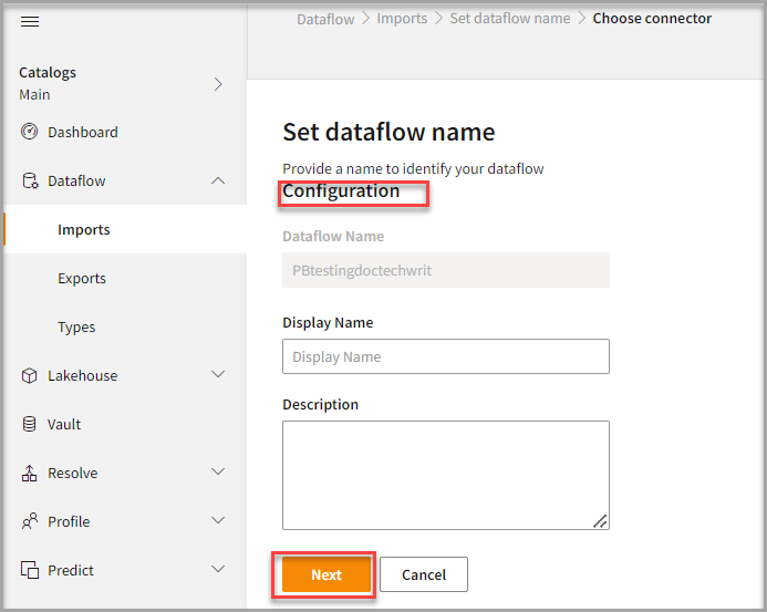 - In the Set dataflow name page, enter the Display Name to identify your dataflow.