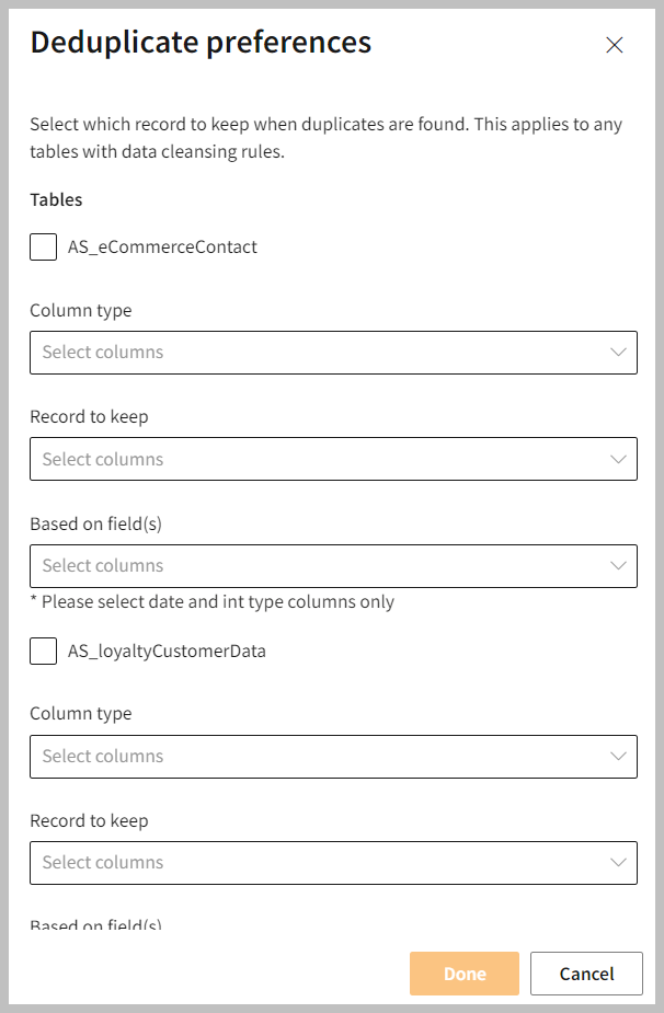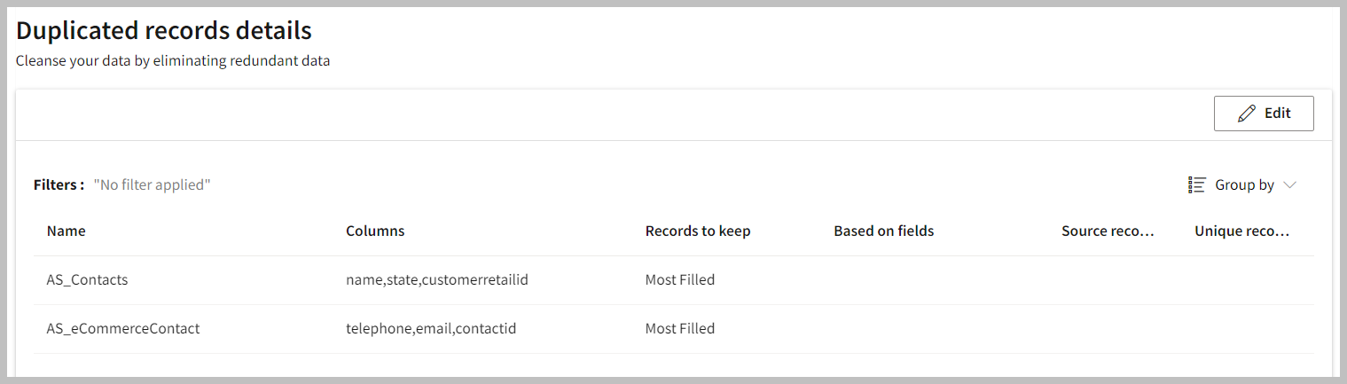 The Deduplication process identifies the duplicated records and cleanses your data by eliminating redundant data. For example, there are 100 individual data records, but 50 out of the 100 records are duplicates. To unify the data, you must remove the duplicates so that only 50 unique records will pass to the next step in the process. You can set up rules to eliminate duplicate records within the table. Defining your own deduplication rules gives you the flexibility to select the best record to keep.To identify and resolve the duplicated records