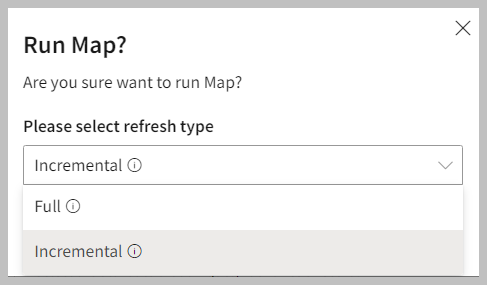 If you run the map for the first time, the system takes it as a full run. For subsequent runs, you can choose between a Full run or an Incremental run. An incremental run adds the data, which was refreshed after the last run. You can get a faster result after the Incremental run.