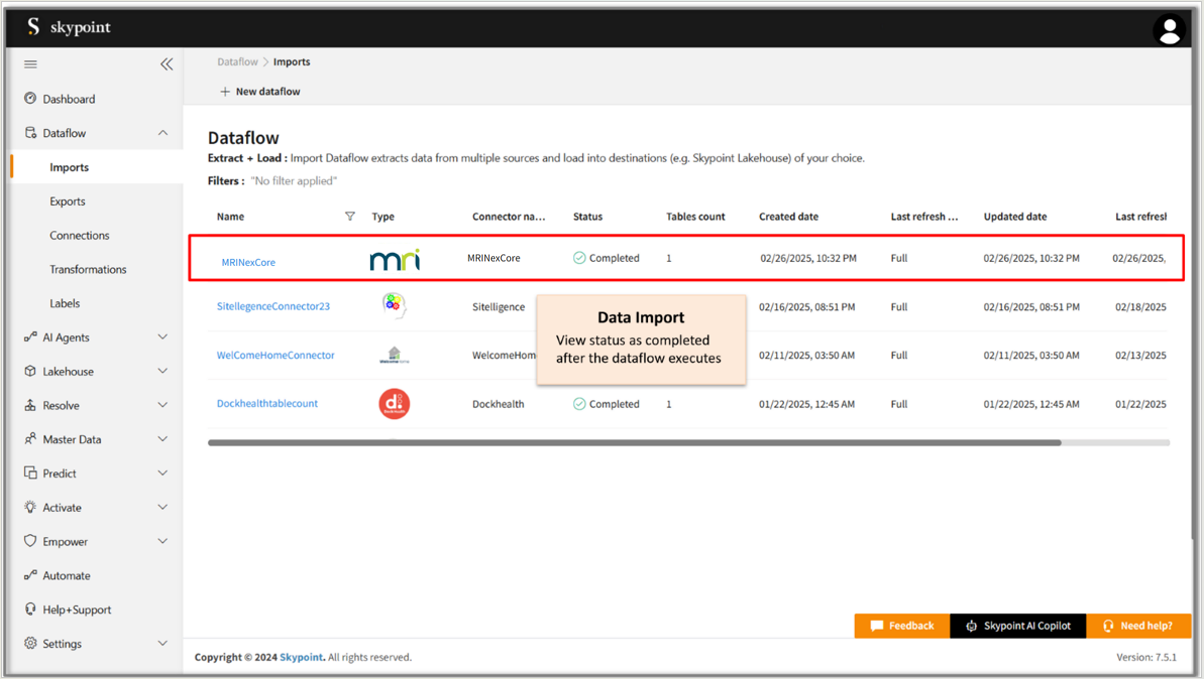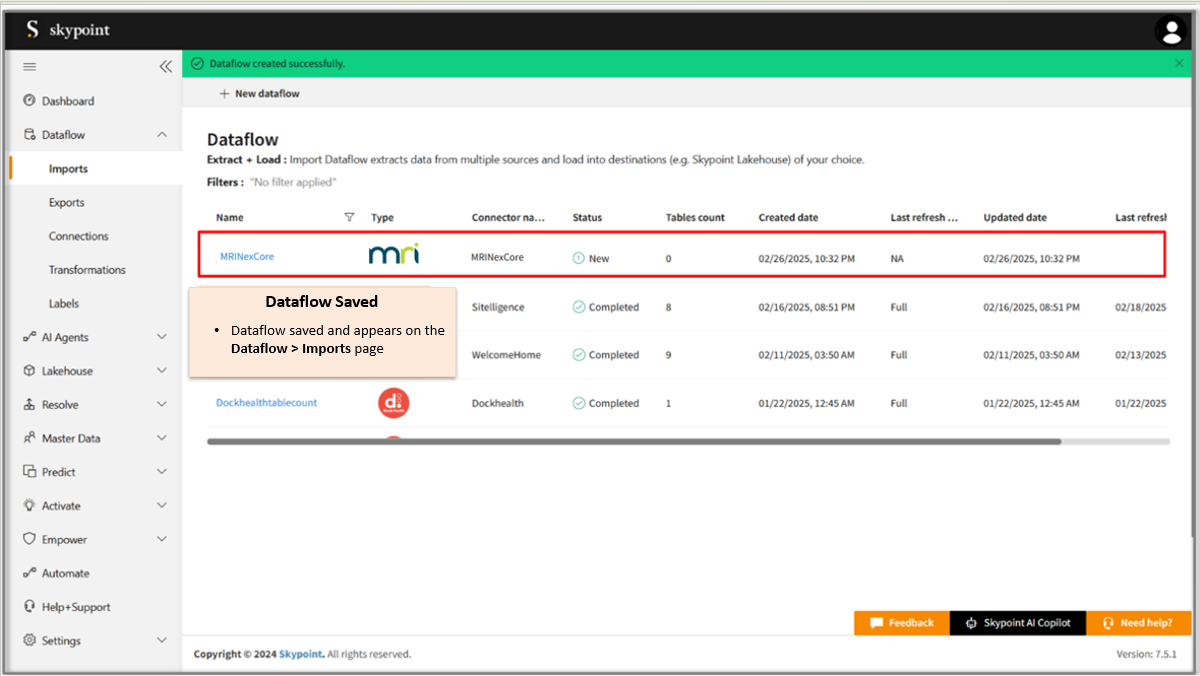 Congratulations ! for saving the MRINexcore connector dataflow, which appears on the Dataflow > Imports page.