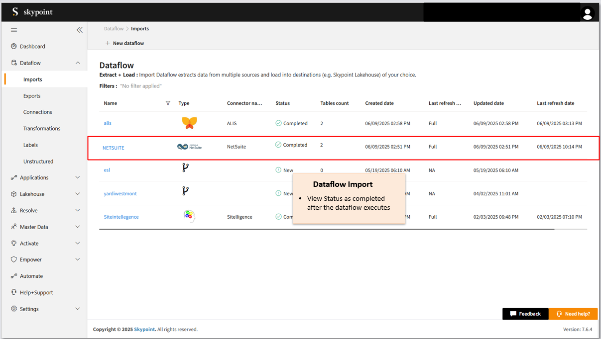 - Go to the Dataflow > Imports page.