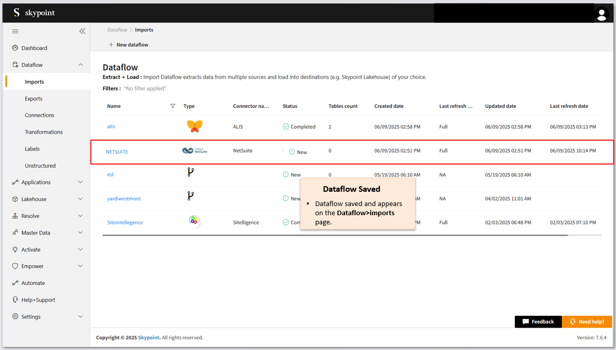 After saving the connection, the NetSuite connector appears on the Dataflow > Imports page.