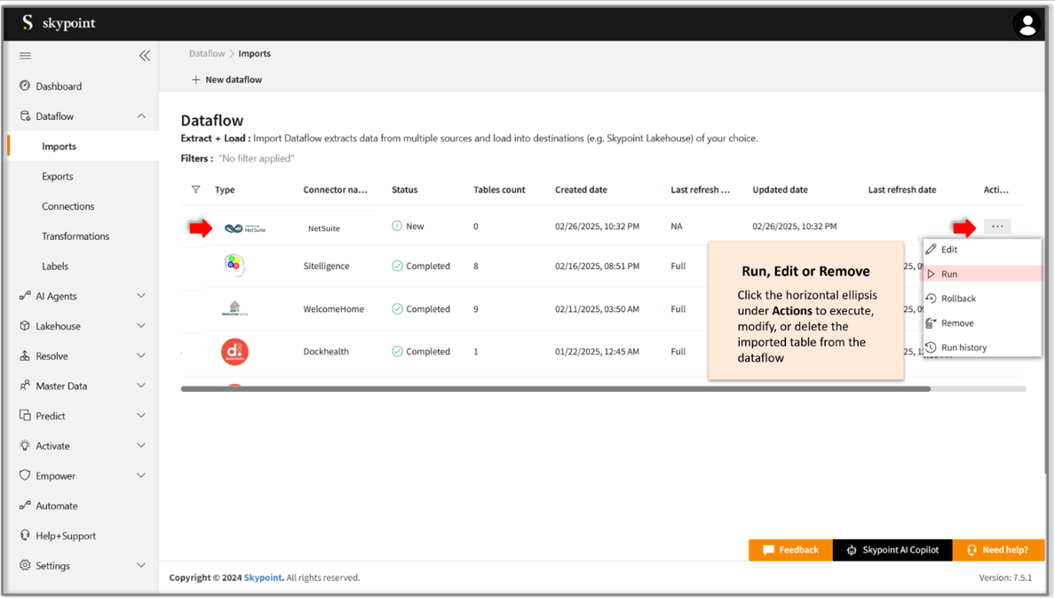 Once the table is imported, you can execute, modify, and remove the imported table from the Dataflow. Follow the below steps: