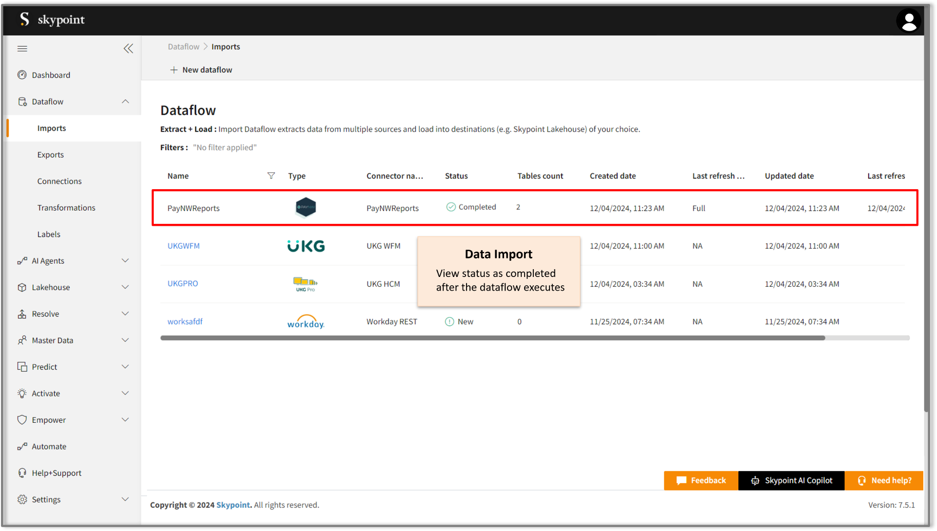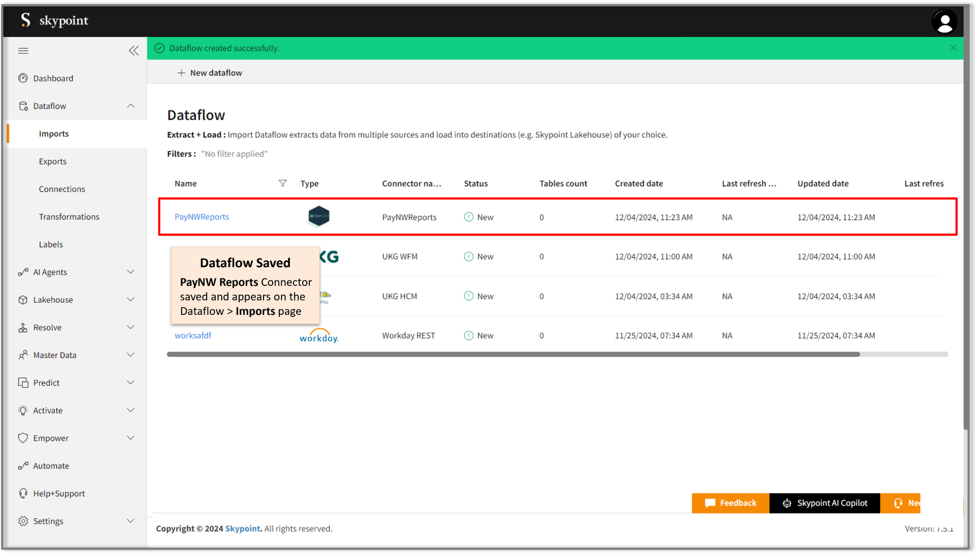 Congratulations ! for saving the PayNW Reports connector dataflow, which appears on the Dataflow > Imports page.
