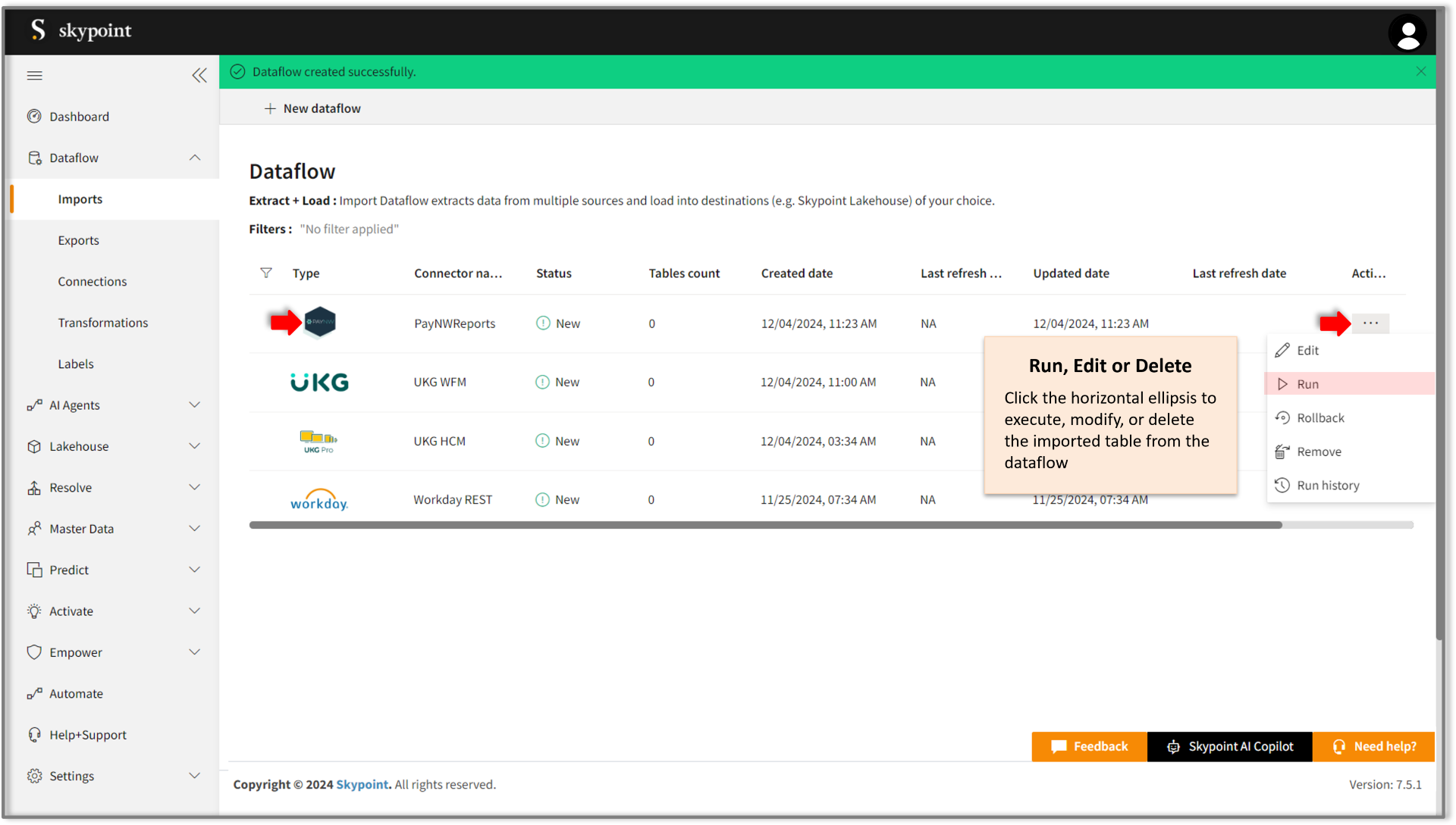 | Modify the Dataflow | Select Edit and modify the Dataflow. Click Save to apply your changes. |