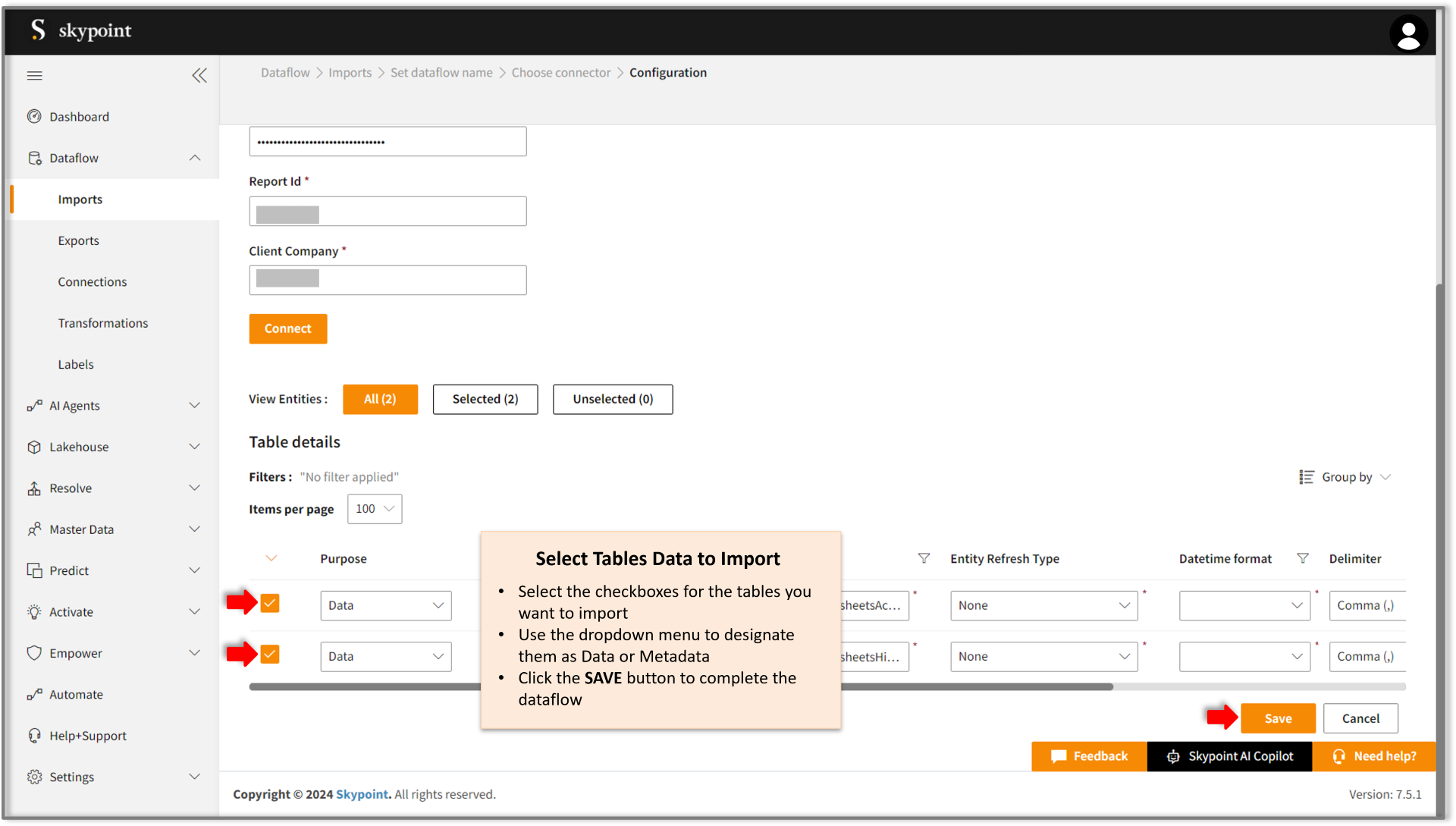 By default, all tables in the Table Details section are selected. You can choose to import only specific tables that are relevant to your data processing needs. For example, to import employee data, select tables containing details like name, email, address, and contact information.