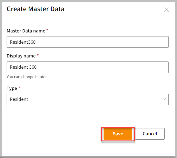 Once the mapping is completed, add and select the master data type. It ensures that the new master data record is associated with the Resident 360 data model and inherits its attributes and properties. For more details, refer to the add master data section.