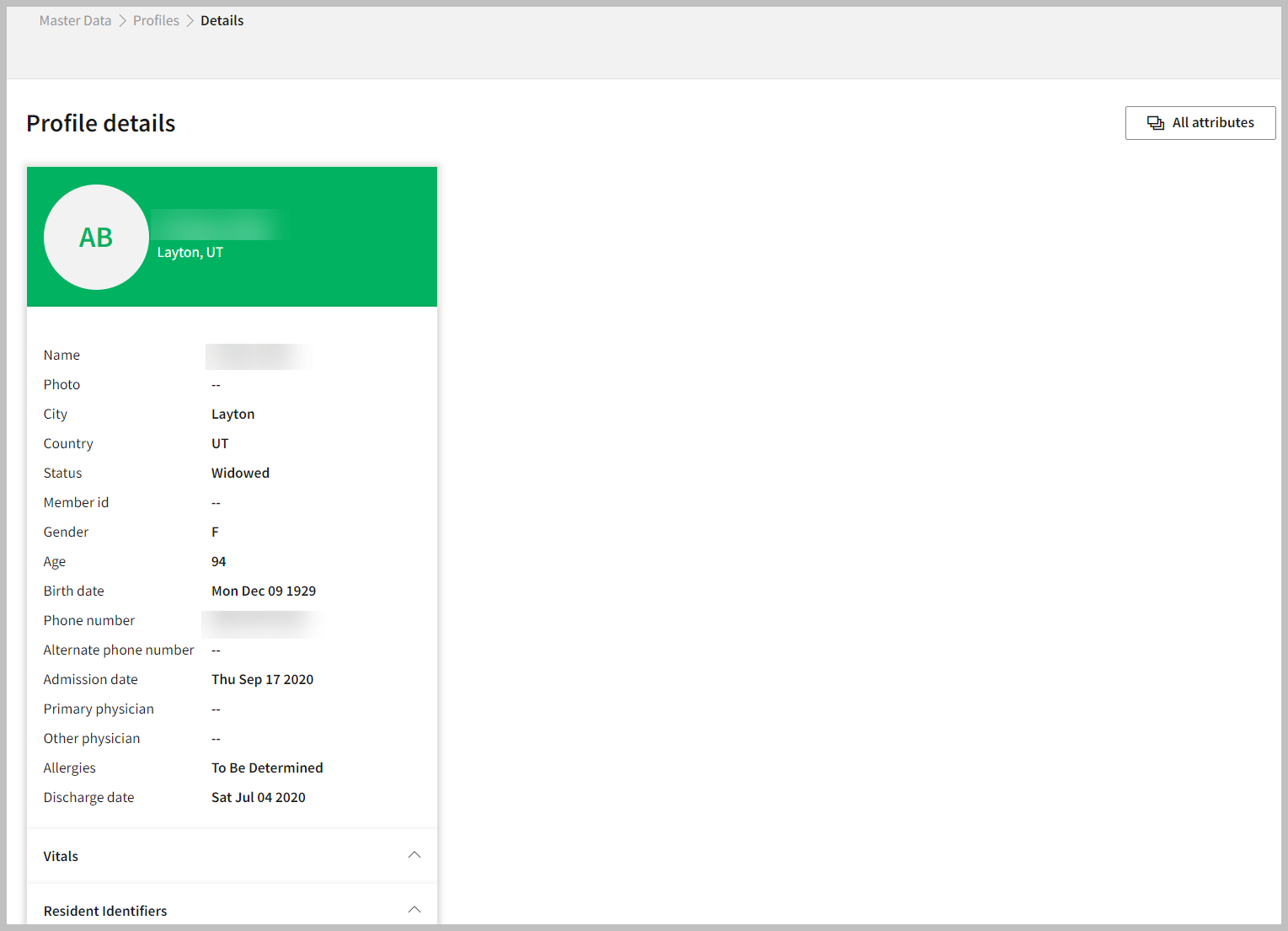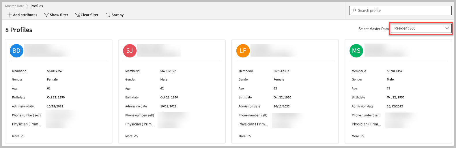 - Select the Resident 360 master data from the drop-down menu. Each profile is displayed on a tile.